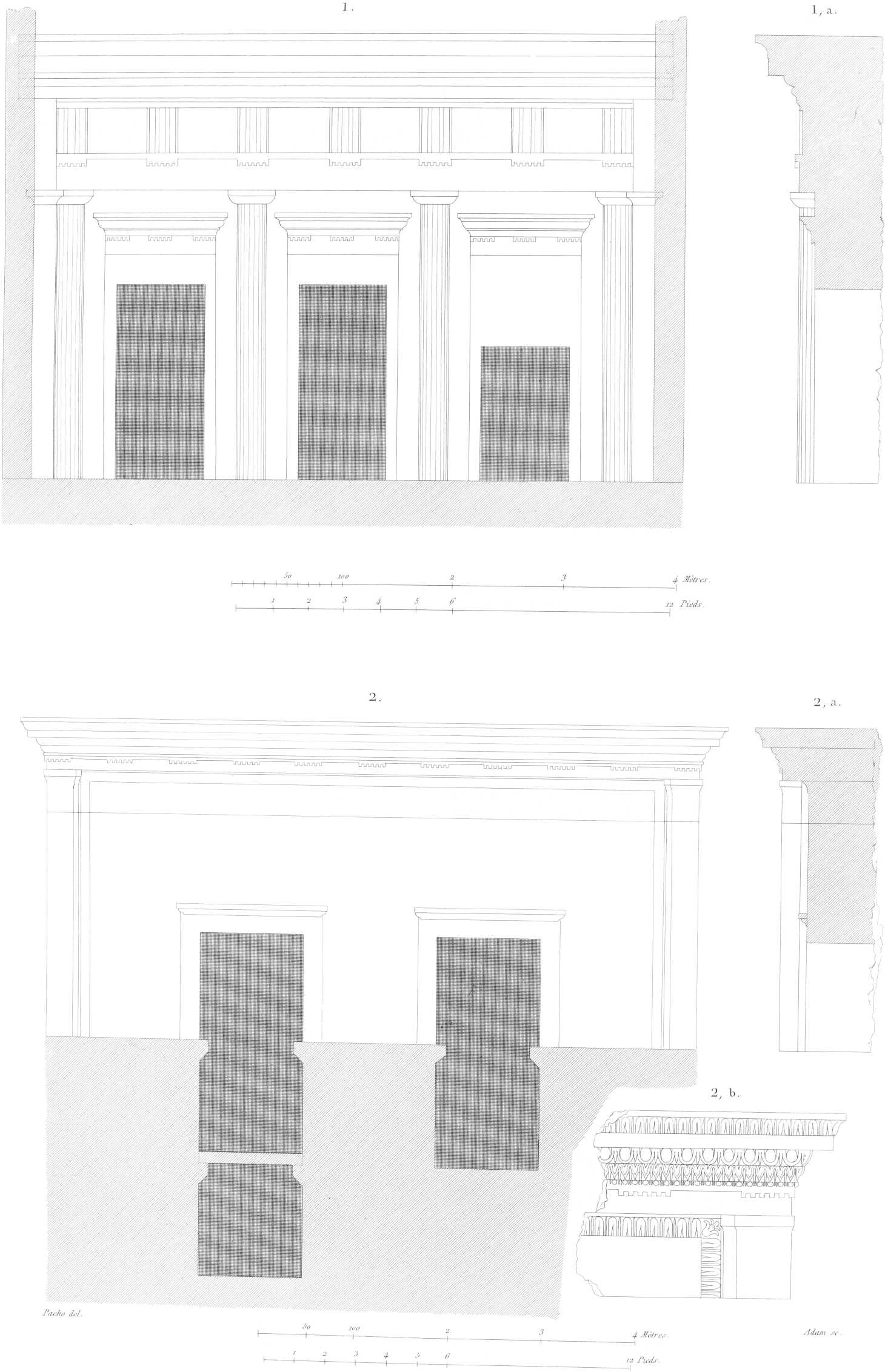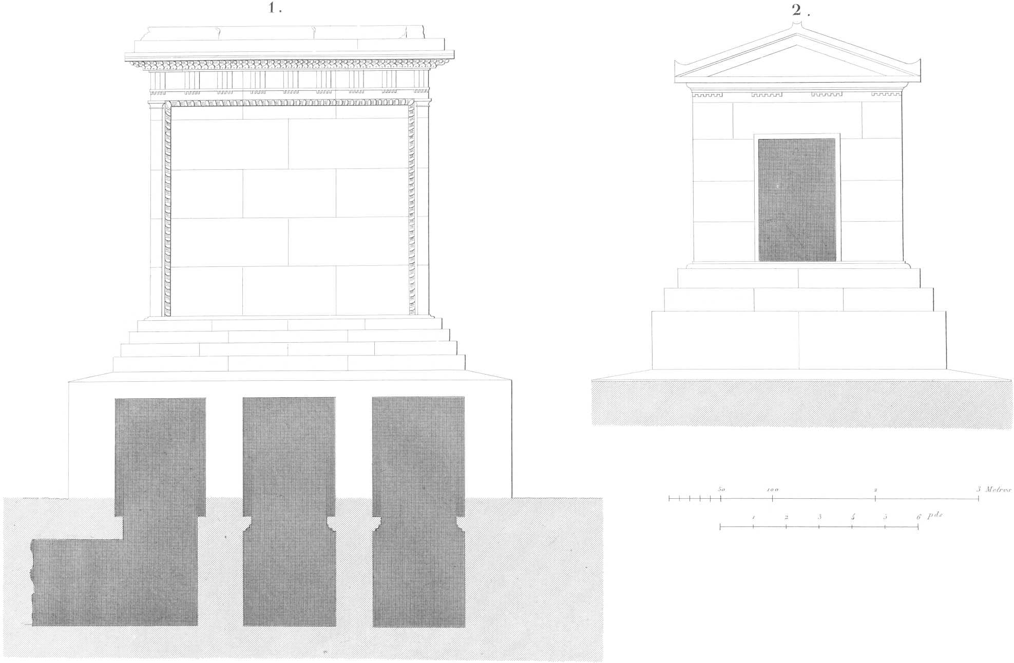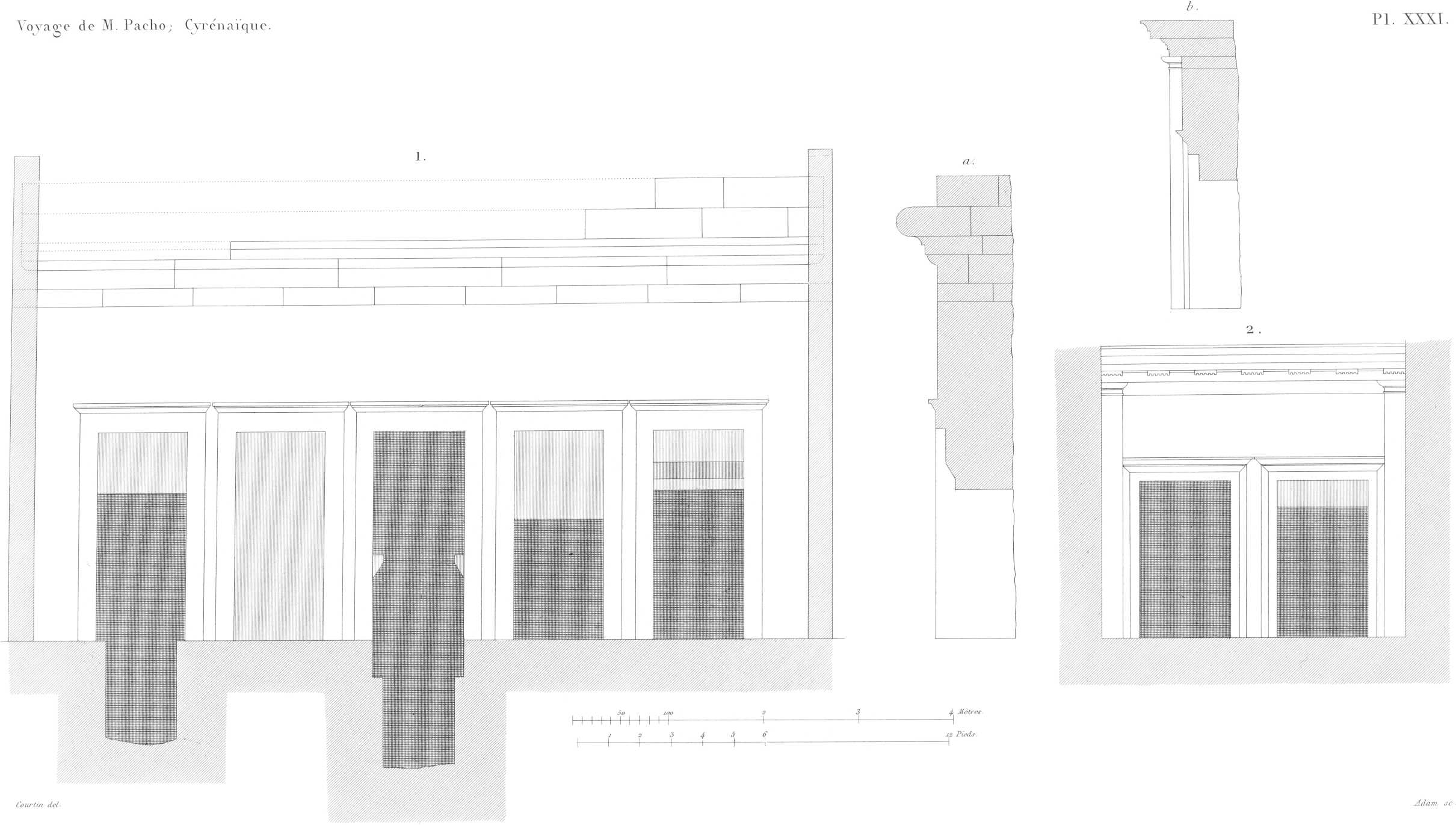 | XLVI. | 1, COUPE DU TOMBEAU, SITUÉ À L’EXTRÉMITÉ ORIENTALE DE LA NÉCROPOLIS DE CYRÈNE ; 2, FAÇADE D’UN AUTRE TOMBEAU. |