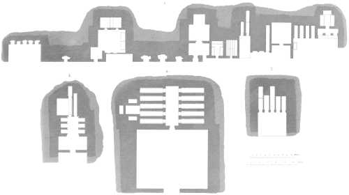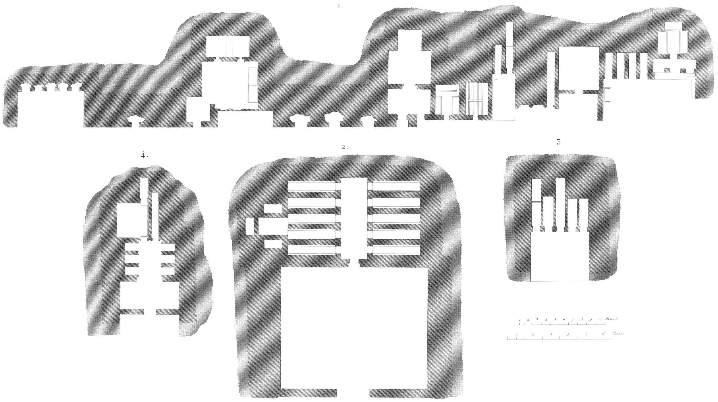 | XI. | 1, 2 ; VUE ET PLANS DE DEUX HYPOGÉES FUNÉRAIRES, SITUÉS DANS LA VALLÉE DE KOUBBÈH. 3, PLAN DU CHÂTEAU DE CHENEDIRÈH. 4, PLANS DES RUINES D’UN TEMPLE DE VÉNUS, SITUÉ AUPRÈS D’APHRODISIAS. |