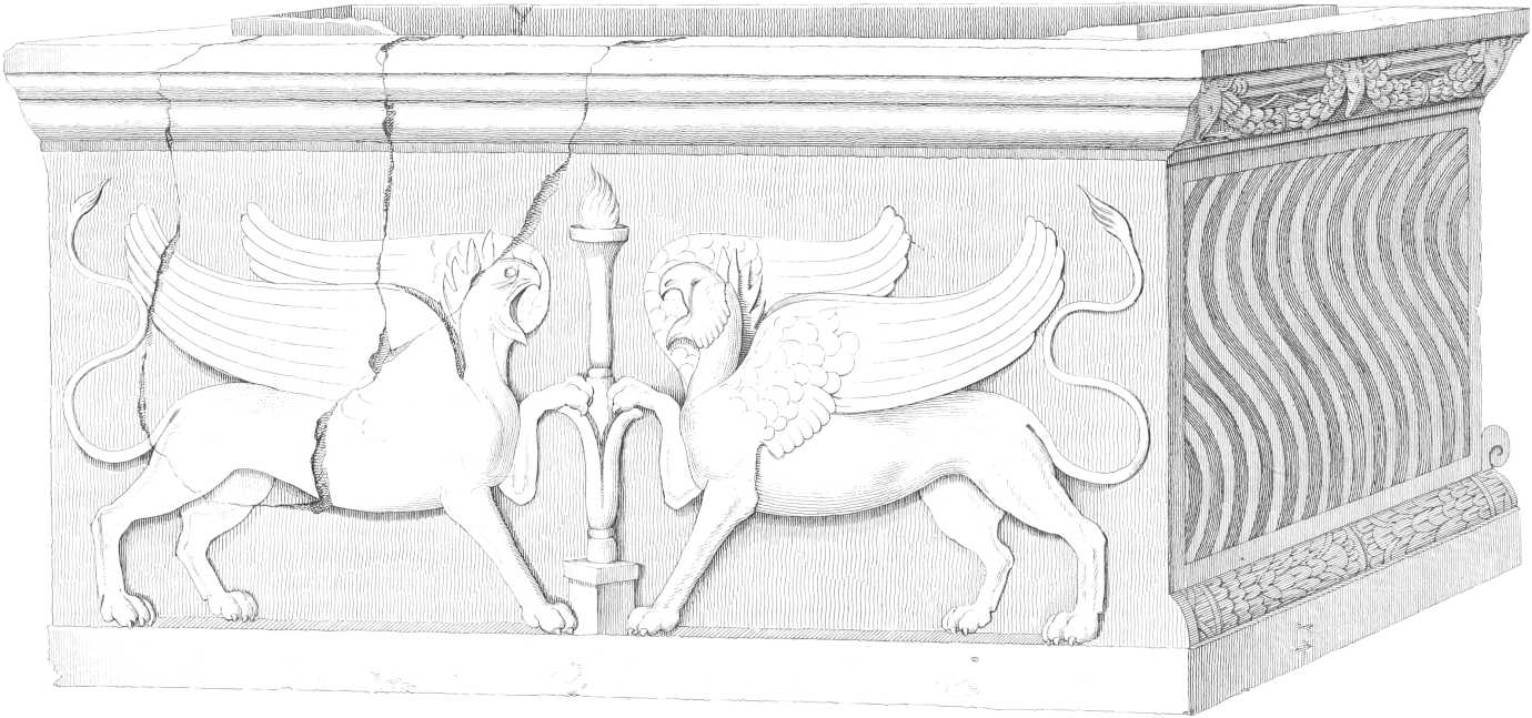 | LVIII. | SARCOPHAGE, SITUÉ DANS L’INTÉRIEUR D’UNE GROTTE, PRÈS DE LA FONTAINE D’APOLLON, À CYRÈNE. |
