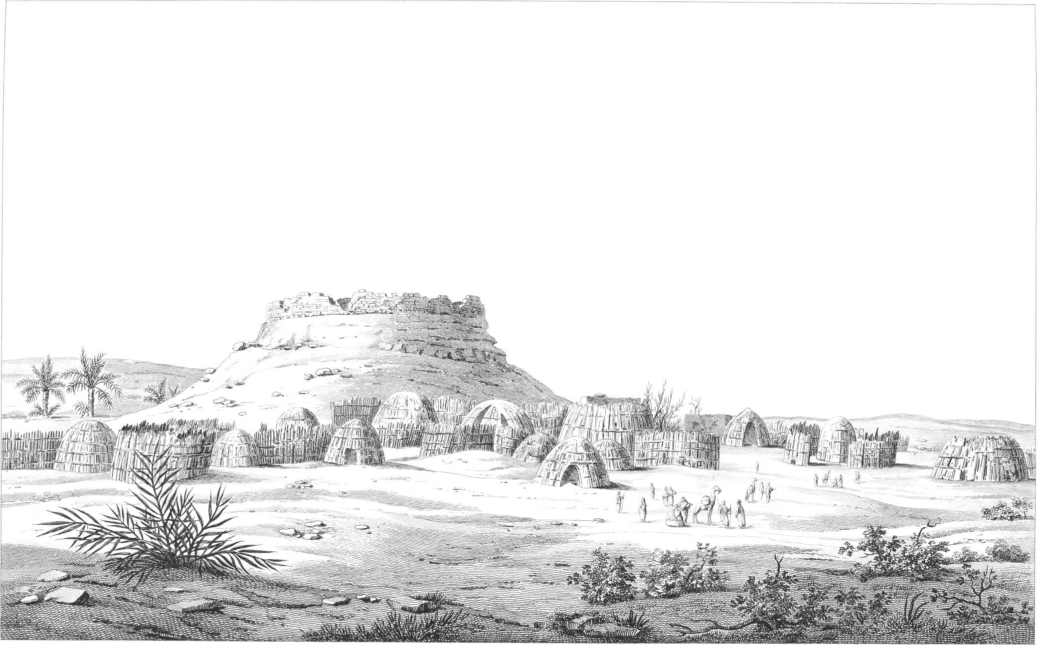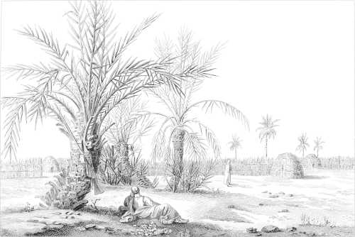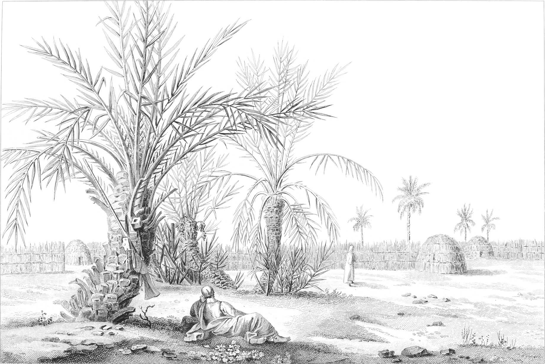 | XCI. | VUE D’UN VILLAGE EN BRANCHES DE PALMIERS, À L’OASIS DE MARADÈH. |