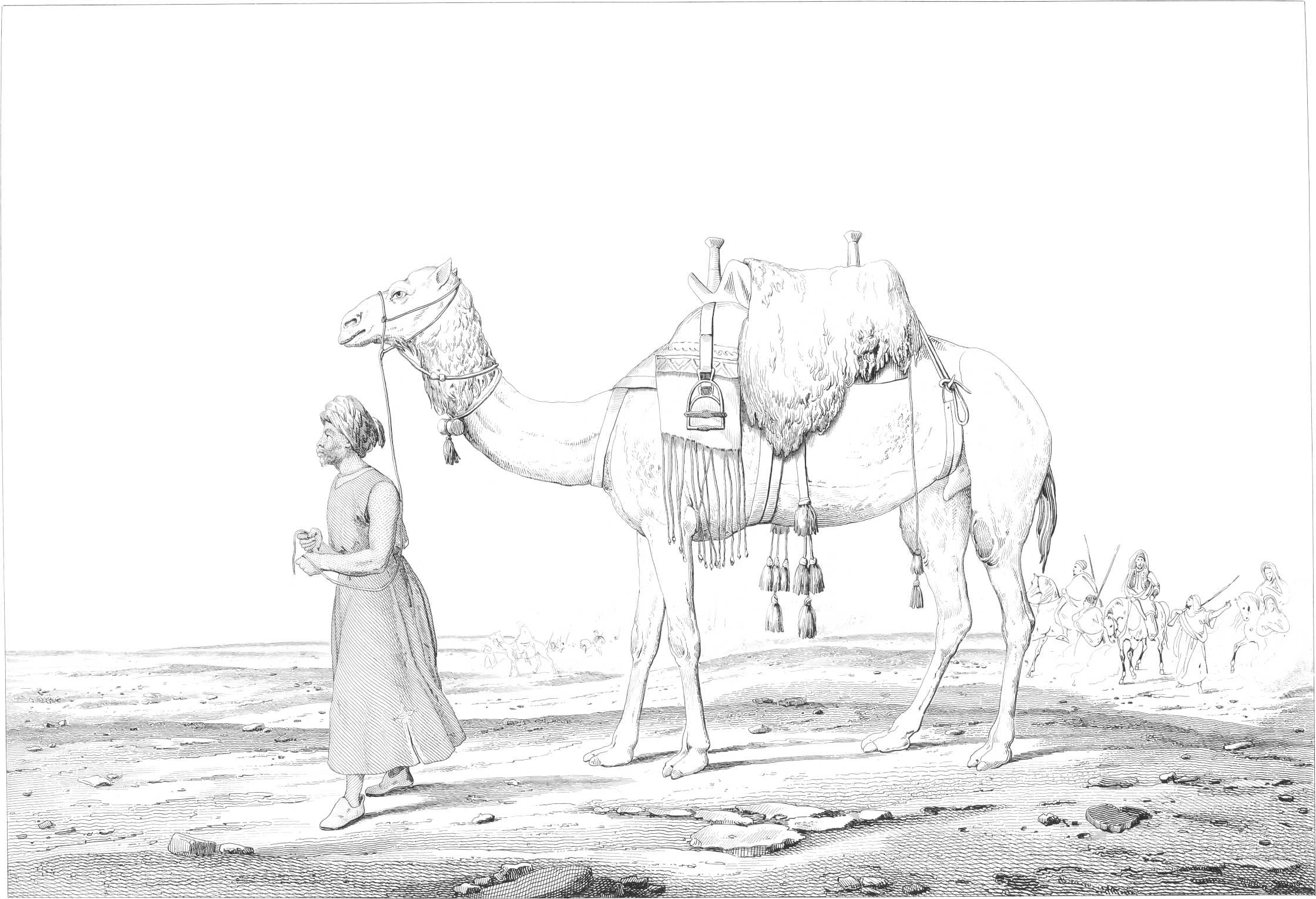 | XCIV. | DROMADAIRE BICHARIÈH, AVEC SES HARNAIS NUBIENS. |