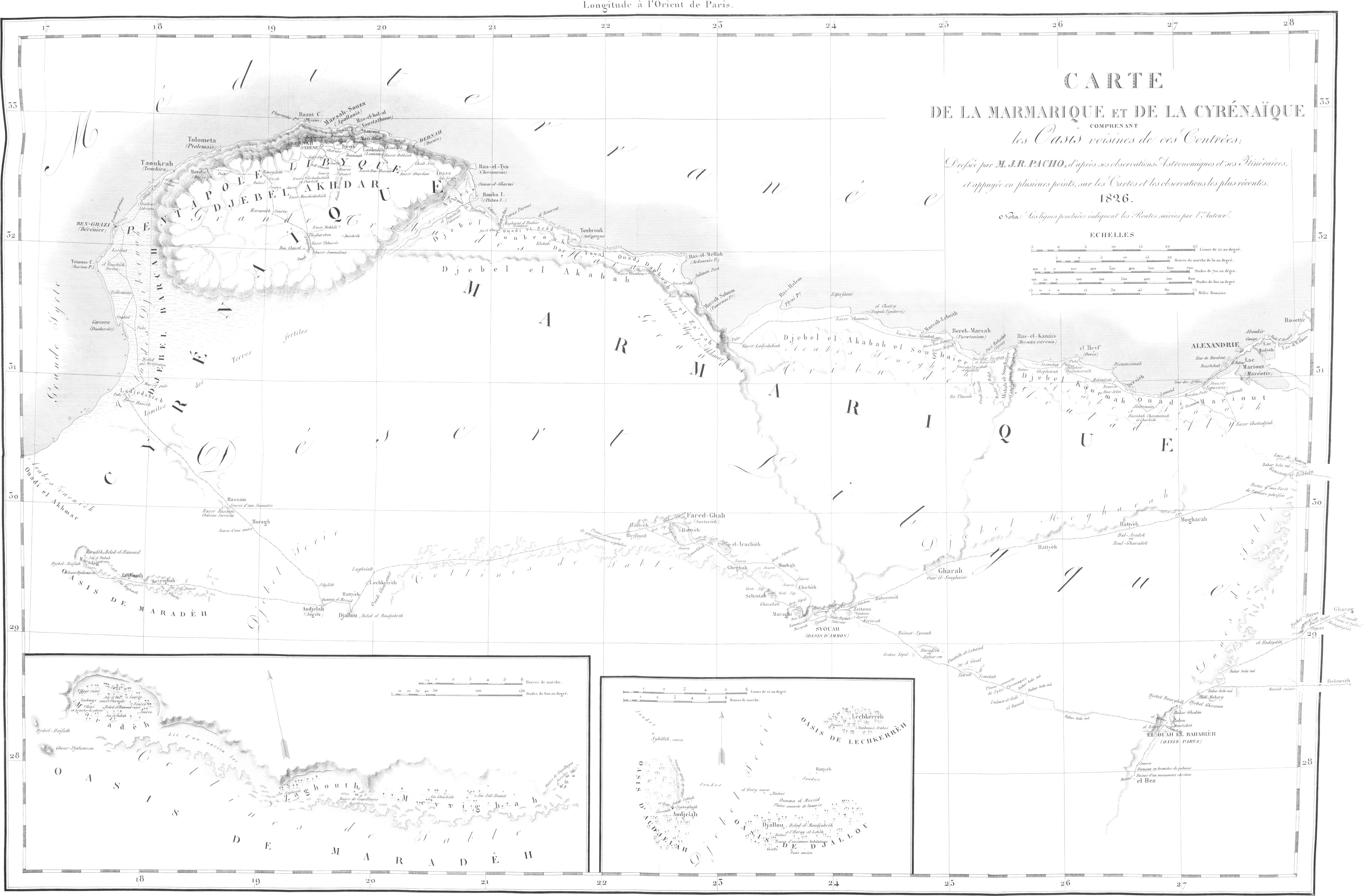 Durant mon premier voyage à l’Oasis d’Ammon[1], les Arabes Aoulâd-Aly m’entretinrent souvent du Djebel-Akhdar, nom moderne de la Pentapole cyrénaïque. Les descriptions qu’ils me firent de leur ancien domaine[2], de ses vertes collines, de la fraîcheur de ses sources et du merveilleux de ses ruines, quoique je les supposasse exagérées, s’accordaient assez avec les traditions historiques et les récits des voyageurs, pour augmenter le désir[ii] que j’avais formé de parcourir cette contrée célèbre. Néanmoins, selon le plan que je m’étais fait, je voulus auparavant connaître les autres Oasis du désert libyque, et ce ne fut qu’à mon retour de Dakhel, que je songeai à mettre mon projet en exécution.