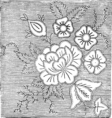 The woodbine honeysuckle can be reproduced in crewels in very natural colors, and we have seen some that almost diffused a June[15] odor about them. They were worked on very fine, soft crash, and intended for a tidy; but a beautiful fire-screen could be made of them on a blue or plum-colored ground.
