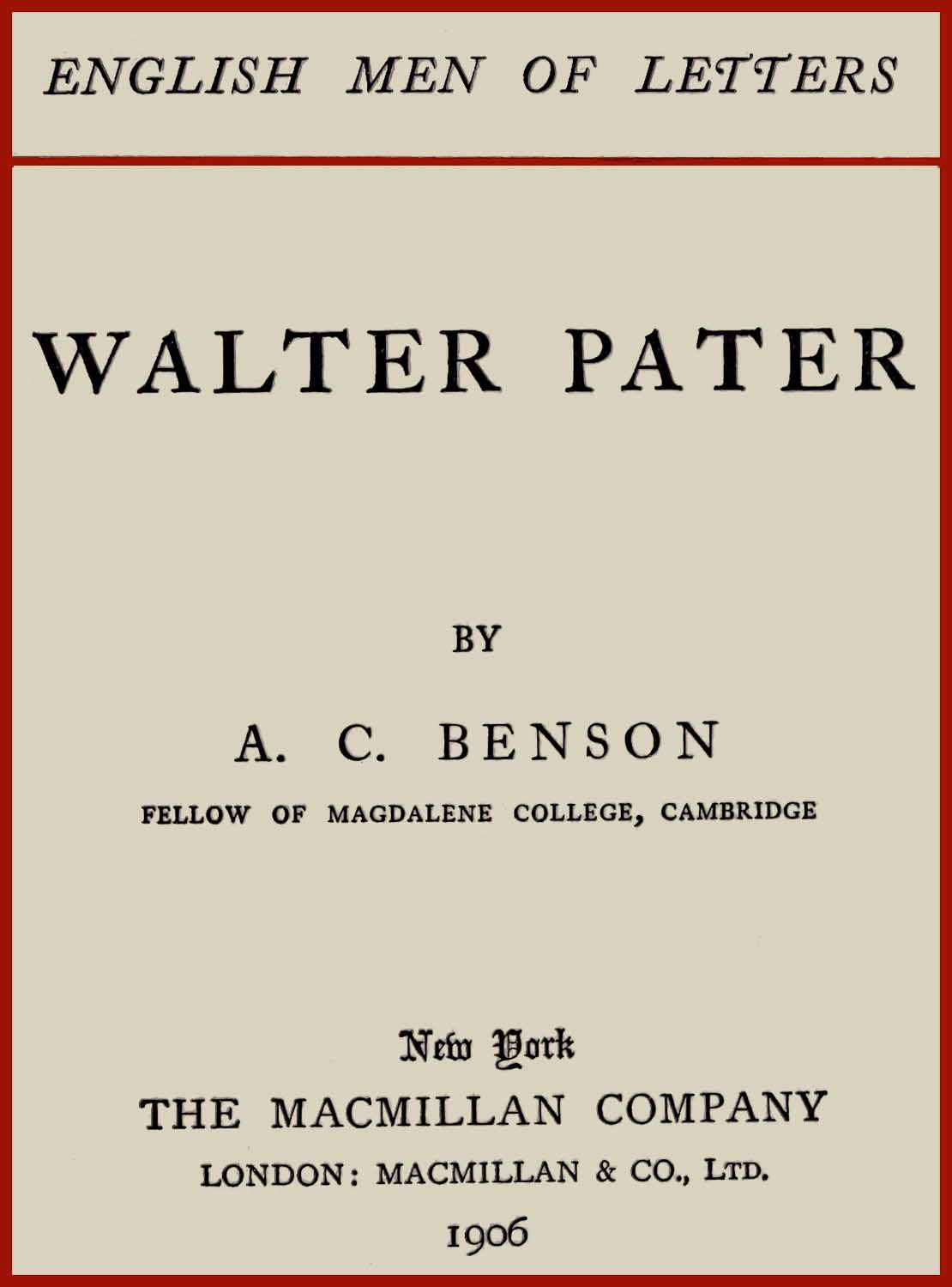 The books and articles which I have consulted, and to some of which reference is made in the following [vi]pages, are the original editions of Pater’s volumes, of various dates, and the Collected Edition of his works, edited by Dr. Shadwell, 1902–1904 (Macmillan and Co.); Essays from the Guardian, privately printed in 1896, and since published 1901 (Macmillan and Co.); A Short History of Modern English Literature, 1898 (Heinemann); Critical Kit-Kats, 1896 (Heinemann), and an article in the Dictionary of National Biography, 1895 (Smith, Elder, and Co.), by Mr. Edmund Gosse; Walter Pater, by Mr. Ferris Greenslet, in the Contemporary Men of Letter Series, 1904 (Heinemann); an essay, Walter Pater, in Studies in Prose and Verse, by Mr. Arthur Symons, 1904 (J. M. Dent); and an article in the Fortnightly Review, “The Work of Mr. Pater,” by Lionel Johnson, September 1894 (Chapman and Hall).