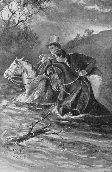 “Good-morning, little girl,” said a winning voice; and the little girl jumped up, reeled, set one foot in the water, and brandished her reticule in the effort to regain her balance. The sugared butter-bread and sweet cookies tumbled against currant-pie and cherries, and all [11]settled to an upside-down condition as she finally got on the bank and saw a gentleman preparing to trip across the stones.