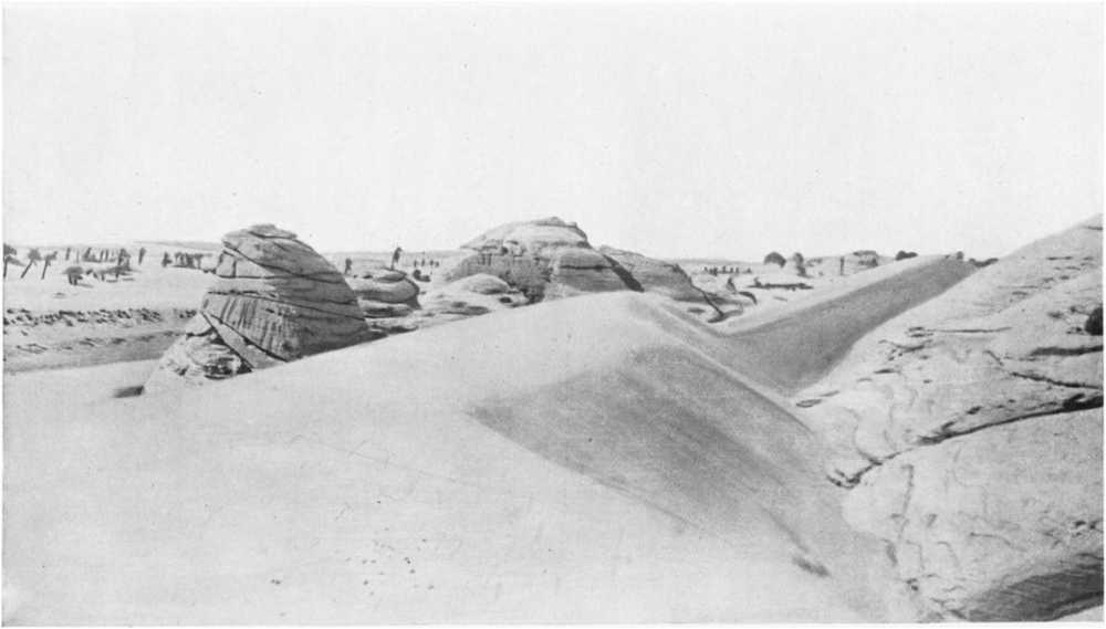 The Route towards Koufra.—Between Tekro and Koufra the distance to be covered is about 350 miles, about half of which had just been reconnoitred by Lieutenant Fouché, commanding the garrison of Ounianga. Marching in a general direction north-north-east he had first crossed a rocky zone of slight elevation, spending four hours in doing so; then for two days he traversed an immense sandy plain, bare of all vegetation, with here and there stretches of rock surface level with the ground; broken lines of rocky heights were visible in the distance to east and west. These heights went to join the plateau of Jef-Jef, in the direction of which he marched for twelve hours during the third day. On the fourth, he found himself in a vast plain from which the Djebel Habid, 50 miles away to the east, can be seen during the first few hours. The fifth day ranges of moving sand-dunes that served as landmarks for the guides were observed to the north-west, and at last, at nightfall on the sixth day, he reached the well of Sarra, lying in a hollow running from south-west to north-east and 30 metres deep.