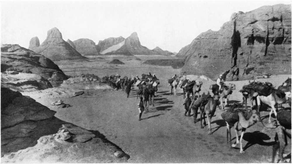 The commercial activity of the oases of Borkou is far from negligible; they export towards the south salt, soda, and dates, and receive in exchange cereals, butter, cattle, and smoke-dried meat. Caravans of two hundred camels may often be seen coming to load up with salt at the Arouelli salt-pits near Ounianga; and Arab caravans pass by on the way from Cyrenaica, by Koufra and Sarra wells, importing to Wadai stuffs, sugar, coffee, tea, mercery, and (in time past) arms and ammunition; and exporting principally millet, butter, smoked meat, hides raw or tanned, ostrich feathers, elephants’ tusks, and so forth. The slave-trade, formerly carried on through Borkou between Wadai and Cyrenaica on a great scale, has almost entirely ceased since we took possession of the country.
