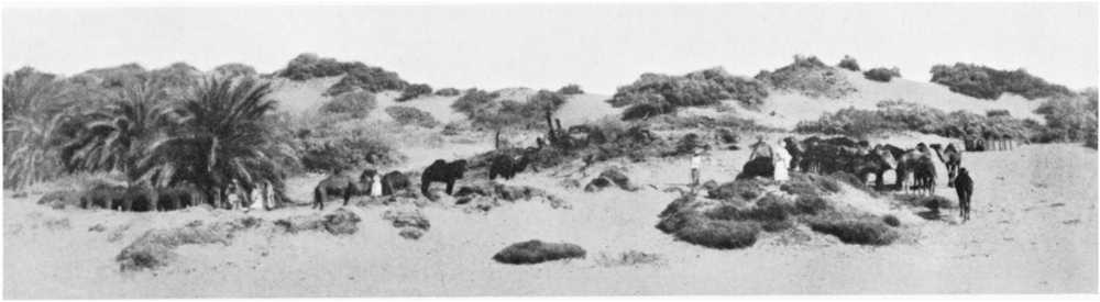 To the north of Sheb, on the Arbain road, are three other water-sources which I visited in 1925 and of which I determined the approximate positions by a carefully controlled car-traverse: Bir Kassaba, in lat. 22° 41′, long. 29° 55′; Bir Abu Hussein, in lat. 22° 53′, long. 29° 55′; and Bir Murr, in lat. 23° 22′, long. 30° 5′. Bir Kassaba is a pool of good water at the foot of a clump of[224] palms; Bir Abu Hussein, which likewise yields good water, is a small excavation in sand near a hill of pink coarse-grained granite, and usually requires to be dug out afresh by each traveller; Bir Murr, on a little plain surrounded by hills, consists of several holes, with fairly good water, excavated in the sand at the south side of the outcrop of a steeply inclined bed of speckled calcareous sandstone.