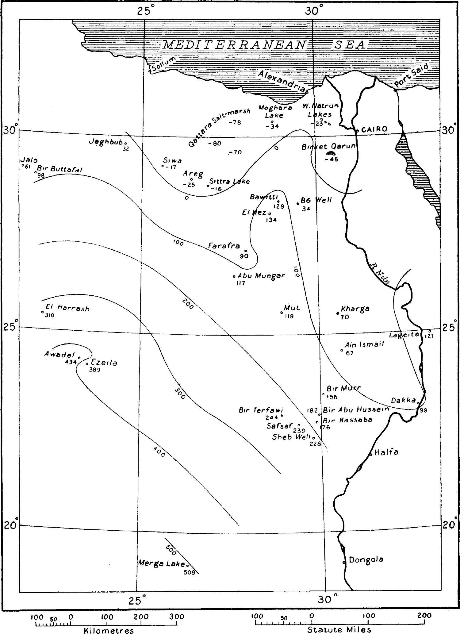 The first requisite for the construction of a map showing the contours of the static water-surface was, of course, a sufficiency of well-determined[109] positions of points where the static water-level of the artesian supply was fairly exactly known. Such points are the springs and wells of the various oases, the surfaces of lakes occupying depressions and presumably fed by underground supplies, and any places on the Nile where the river taps artesian beds.