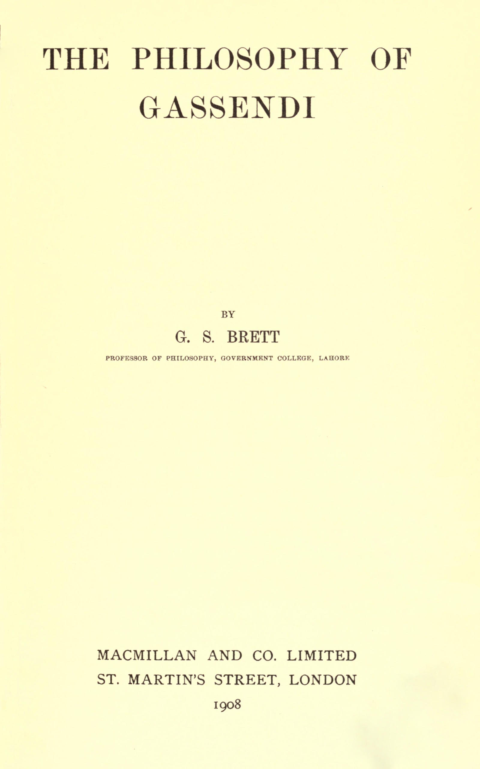 (III.) The only book on Gassendi which I have read is La Philosophie de Gassendi, par P.-Félix Thomas, Paris, [xvi]1889. I have read this since completing my own account of Gassendi, and owe to it some useful hints and references. Had it been other than it is, I should not have been justified in publishing a second study on the same subject. But the author seems to me to have done less than justice to Gassendi: he does not seem to have considered him an integral part of philosophy as a moving body of thought. Perhaps he is right, but to me Gassendi appears to have done more than patch up Epicurus: he has tried to unite the results, not only of philosophy in the narrower sense, but of all previous and contemporary thought into one whole, as consistent as he thought it could be. Hence we differ; but the student of Gassendi will get more insight into Gassendi from Thomas than he will from Bernier, and find this the conscientious work of one who has gone for his information to the fountain-head.