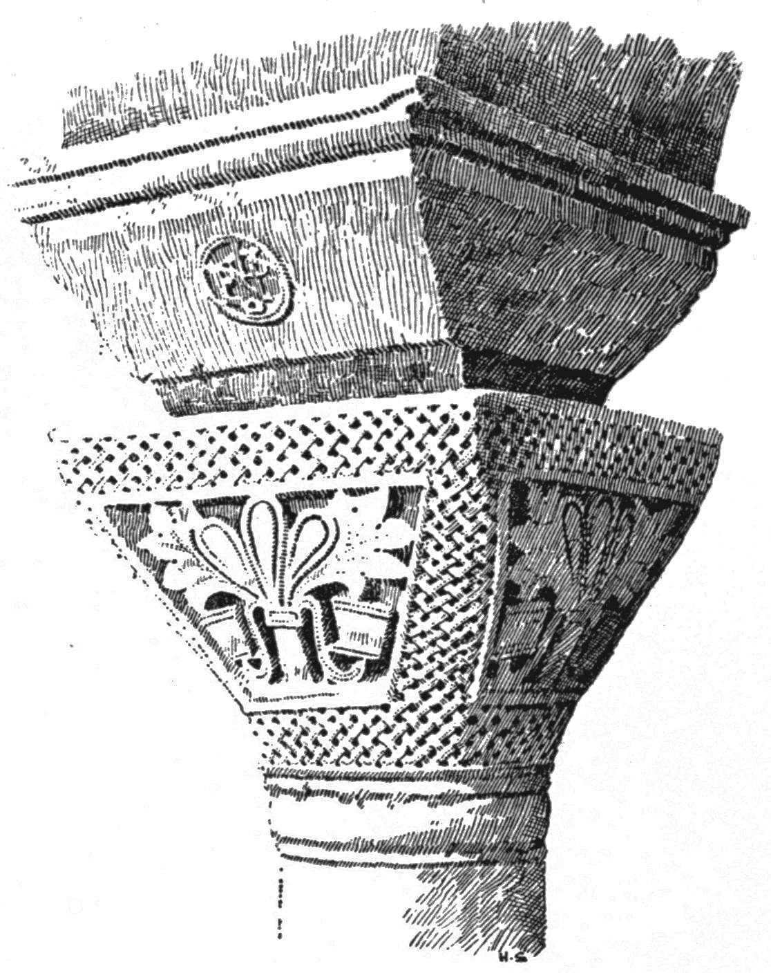 [13] Of the capitals of the columns, the most usual were what is commonly termed cushion capitals; these were not invented by the Norman architects, but under their hands put on a character of their own.