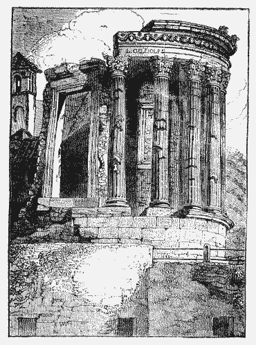 On the summit of the lofty and precipitous rock that flanks this gulf on the right, stands the temple traditionally, and most probably correctly, called of the Sibyl, though some antiquaries have chosen to dedicate it to the goddess Vesta. This truly beautiful pile is circular. It was formed of eighteen pillars in the finest style of the graceful Corinthian order, but of these pillars ten only remain with their entablature. Nothing can be more striking and felicitous than its situation, which even surpasses the intrinsic beauty of its structure. The contrast of its placid gracefulness with the turbulence and fury of the water immediately beneath it, also adds to the exquisite effect it produces. “This singular ruin, the most beautiful of them all,” says the acute Forsyth, “has been too often engraved to need any details: yet, though prints may combine it with the immediate landscape, what pencil can reach into the black gulf below?”