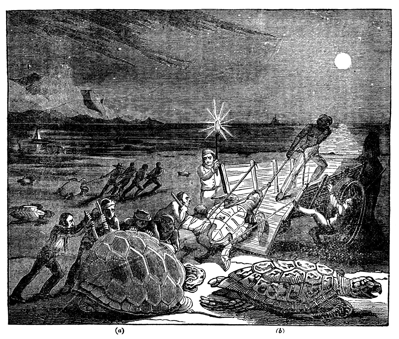 “In spite of the darkness which is chosen by the female tortoises for concealment when employed in laying their eggs, they cannot effectually escape from the pursuit of their enemies: the fishers wait for them on the shore, at the beginning of the night, especially when it is moonlight, and, either as they come from the sea, or as they return after laying their eggs, they either dispatch them with blows of a club, or turn them quickly over on their backs, not giving them time either to defend themselves, or to blind their assailants, by throwing up the sand with their fins. When very large, it requires the efforts of several men to turn them over, and they must often employ the assistance of handspikes or levers for that purpose. The buckler of this species is so flat as to render it impossible for the animal to recover the recumbent posture, when it is once turned on its back.
