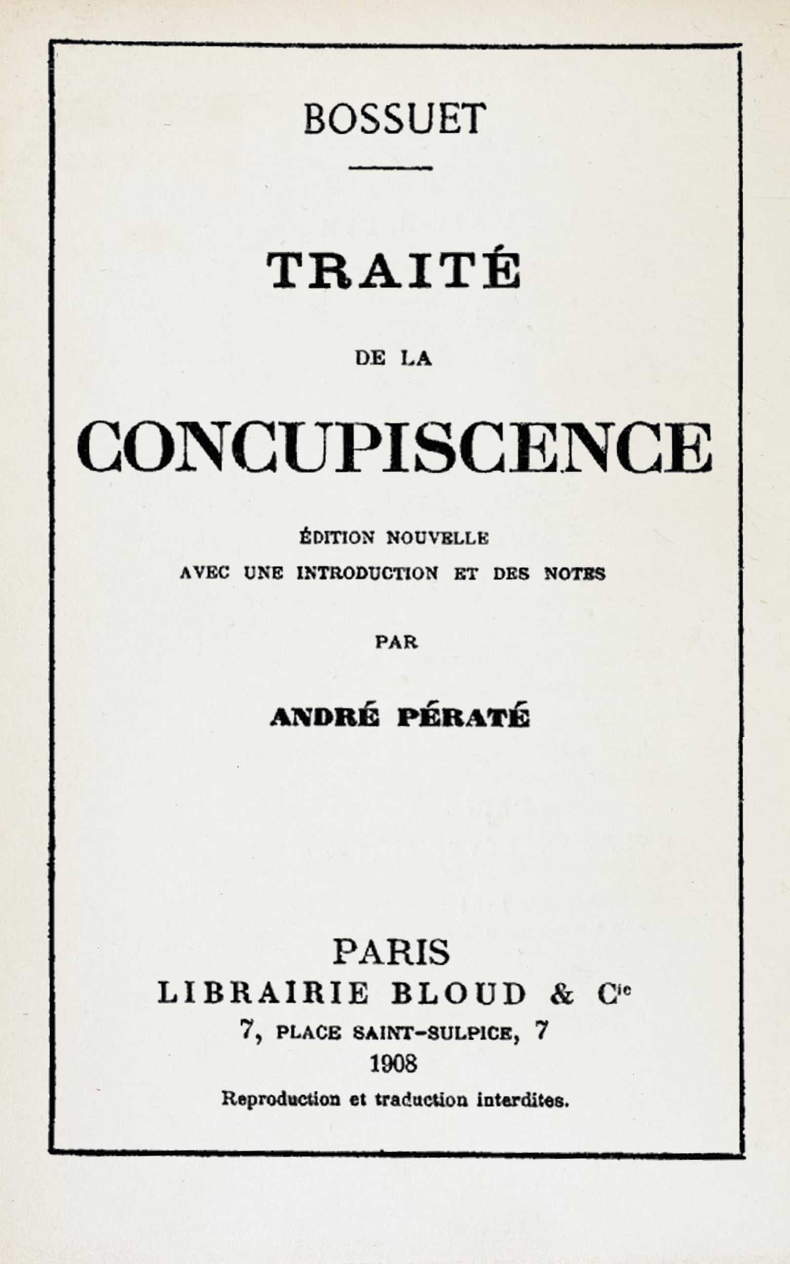 L’histoire des éditions de ce petit chef-d’œuvre peut se résumer brièvement. Il faisait partie des manuscrits que le neveu de Bossuet publia bien des années après la mort du grand évêque. Il parut, en 1731, sous le titre nouveau qui lui est resté, à la suite du Traité du libre arbitre. Puis il fut inséré dans les éditions successives des œuvres complètes de Bossuet, notamment, en 1772, au tome III (p. 199-269) de la grande édition des Bénédictins, avec des corrections données en appendice (p. 794-796) par Dom Déforis, et, en 1816, au tome X (p. 341-446) de l’édition de Versailles, qui admet quelques variantes nouvelles. Les éditions qui ont suivi, au cours du XIXe siècle, n’offrent aucun intérêt pour le texte. Lorsque Silvestre de Sacy entreprit de publier chez Techener sa charmante Bibliothèque spirituelle, il ne manqua pas d’y comprendre le Traité de la Concupiscence ; malheureusement il crut bon de le donner en complément des Lettres de piété et de direction écrites à la Sœur Cornuau ; et l’on ne tira qu’un petit nombre d’exemplaires de ces deux volumes destinés aux bibliophiles. Enfin il existe en librairie deux ou trois recueils des Opuscules de Bossuet, comprenant notre Traité. Mais, outre qu’il y voisine avec des ouvrages très différents, tels que le Traité du libre arbitre et la Logique, ou encore la Lettre et les Maximes sur la Comédie, le texte, pris au hasard, tantôt de l’édition de 1731, tantôt des éditions modernes, y est rempli d’incorrections.