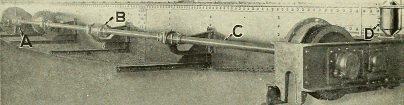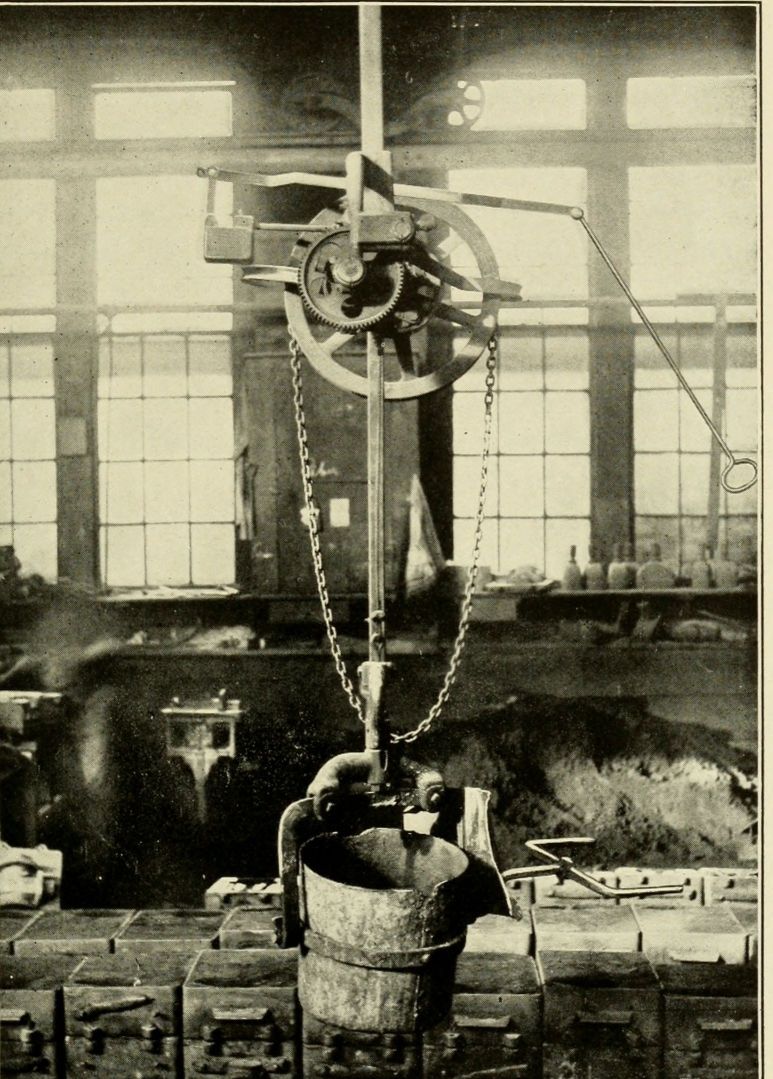 (Observe the inclosure for the gears, and the shield to prevent the molten metal from splashing on the operator when pouring and when pushing the ladle along the track.)