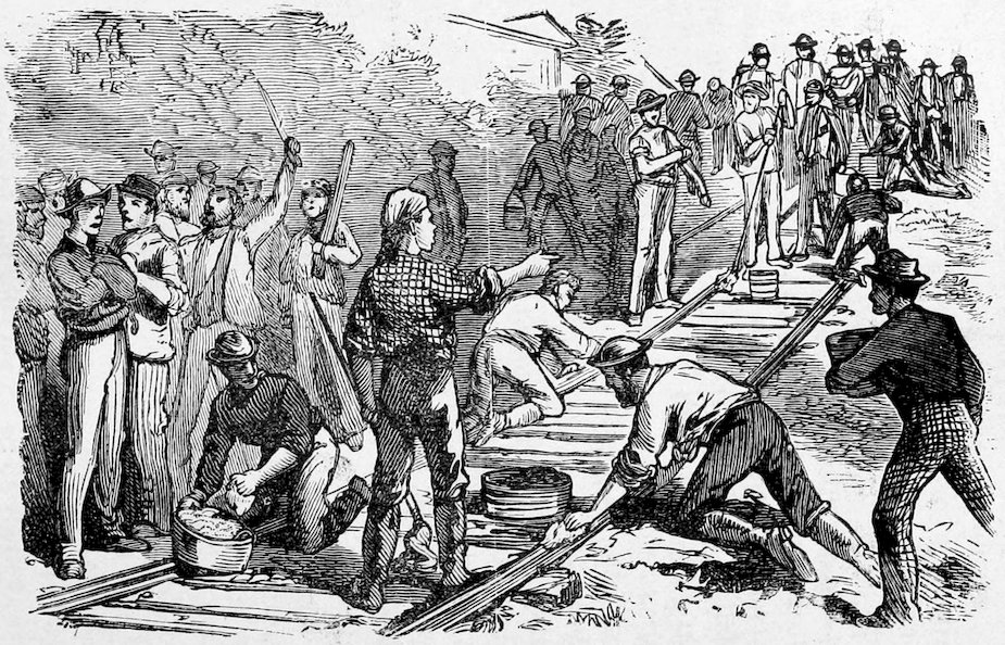 In this uprising of the laborers against their employers, aggravated as it was by the early appearance on the scene, of a vast number of theorists, and dangerous characters, who sought their opportunity, during the reign of general tumult to subvert the very fundamental principles of social order, we have gained a deeper knowledge of the character of the American people. Sudden as a thunder-burst from a clear sky, the crisis came upon the country. Hundreds and thousands of men belonging to the laboring classes, alleging that they were wronged and oppressed, ceased to work, seized railroads, closed factories, founderies, shops and mills, laid a complete embargo on all internal commerce, interrupted travel, and bid defiance to the ordinary instruments of legal authority. Commencing at Camden Station, Baltimore, and at Martinsburg, West Virginia, in three days the movement had extended to Pittsburgh, Newark, Ohio, Hornellsville, Fort Wayne and a hundred other points. State militia forces were encountered and repelled. The whole country seemed stricken by a profound dread of impending ruin. In the large cities the cause of the strikers was espoused by a nondescript class of the idle, the vicious, the visionary and the whole rabble of the Pariahs of society. No standing army was available, and these classes absolutely controlled the country.