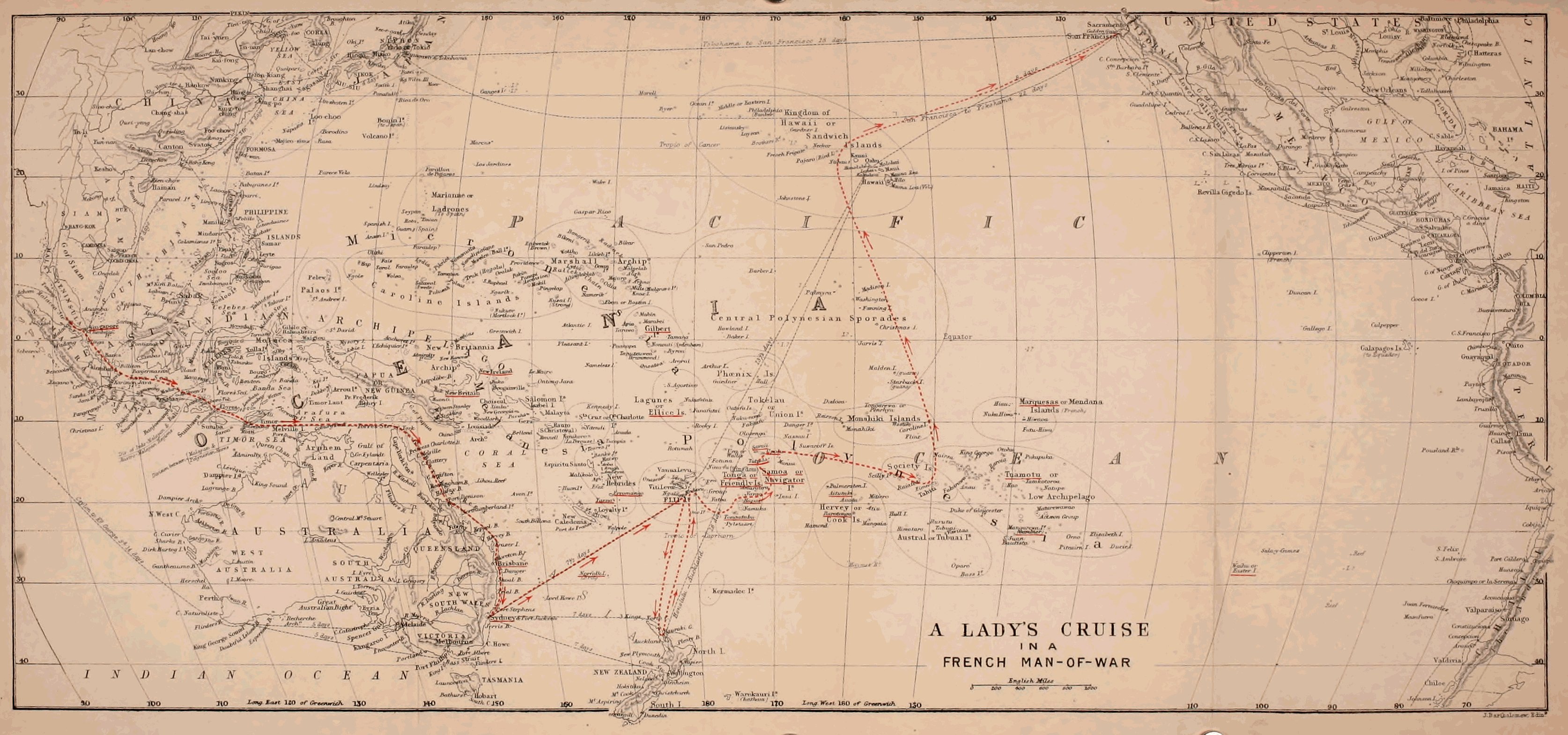 My French friends urge my going on to Tahiti, the loveliest isle in the South Seas; but the utter uncertainty of how to get back thence, either here or to Tasmania, where Lady Gordon hopes to spend Christmas, makes me hesitate. If I could reach the Sandwich Isles, I should then be on the direct line of the Pacific mail-steamers; but Tahiti is utterly out of the world, and till the Seignelay arrives there, she will not receive her further orders, and may perhaps be sent to Valparaiso, which has no attractions for me. So my line of march is at present somewhat undecided. I think I shall almost certainly return here from Samoa; but as B. long ago said, of my wandering propensities, that I was just like a knotless thread, I may perhaps slip through, and you may hear of my vanishing into space!