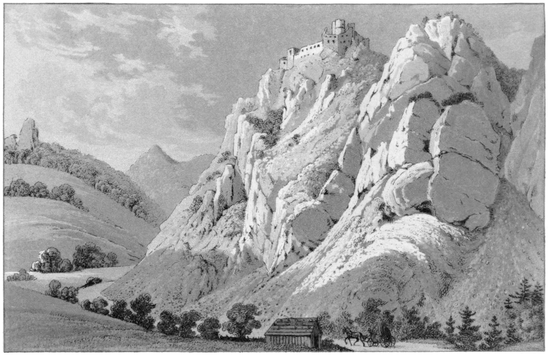 Vor zwei Jahren bestieg ich die Trümmer welche gutmüthig den letzten Reichthum — eine herrliche Uebersicht schenken. Der Thurm ist zerfallen, die Gemäuer wüste, nur ein unterirdischer Gang mehrere Klafter fortleitend, verspricht noch Schutz wider Regen und Schnee; allein eine Kolonie eckelhafter Bewohner der Finsterniß darin, wären zu abschreckend dem genügsamsten Menschen!