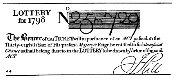 [19] The earliest lottery ticket I have seen, is in the collection of Miss Sophia Banks, sister of the famous Sir Joseph (Brit. Mus. 1890, e). It represents an eighth share in the lottery of 1775.