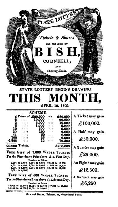[20] Bish’s price in December, 1800, for a ticket in this lottery was £16 18s., and he says, “Tickets and Shares will rise gradually, as the Drawing approaches.”