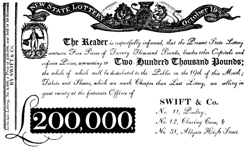 [Pg 327] “Dr. B____, a physician at Lime (Dorset), a few days since, being under pecuniary embarrassment, and his house surrounded by bailiffs, made his escape by a window into a neighbour’s house, from whence he fled to London. The furniture was seized, and the sale actually commenced, when it was stopped by a letter, stating that the doctor, on his arrival in London, found himself the proprietor of the £20,000 prize. We guarantee the truth of this fact” (Times, December 27, 1797).