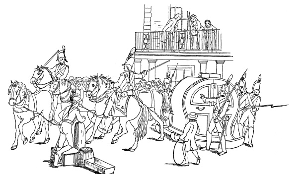 The place where the tickets were manipulated by the managers was afterwards changed from Whitehall to Somerset House, and the accompanying illustration shows the manner of conveying the lottery wheels from Somerset House (or Place, as it was then called) to Cooper’s Hall, in 1808. There were four sledges employed, two carrying the wheels containing the tickets, and the other two the cases for the wheels. They were escorted by a detachment of Life Guards, dismounted, who had to do police duty, there being no police, as we know them, in those days.