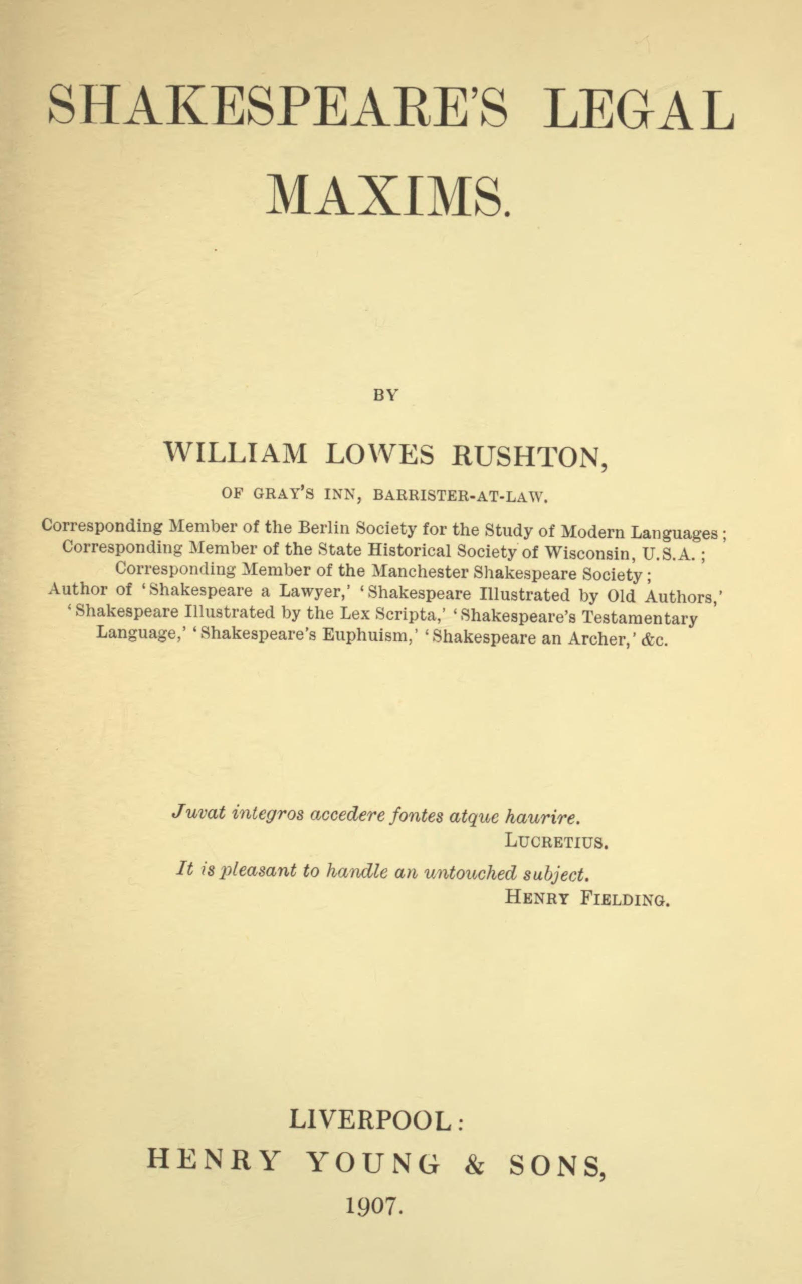 In the plays of Ben Jonson, George Chapman, and other dramatists of their time, legal maxims are to be seen in Latin. Shakespeare never quotes legal maxims in Latin, but he gives correct translations of them which are so embodied in his verse and prose that they have not the appearance of quotations. This may be one of the reasons why they have not been noticed by the commentators. Another reason may be that the commentators who were not members of the legal profession did not recognise them because they were ignorant of law, and the commentators who were lawyers did not recognise them because they were ignorant of Shakespeare. Shakespeare’s correct translations of legal maxims are, I think, the only satisfactory evidence we have of his knowledge of Latin.