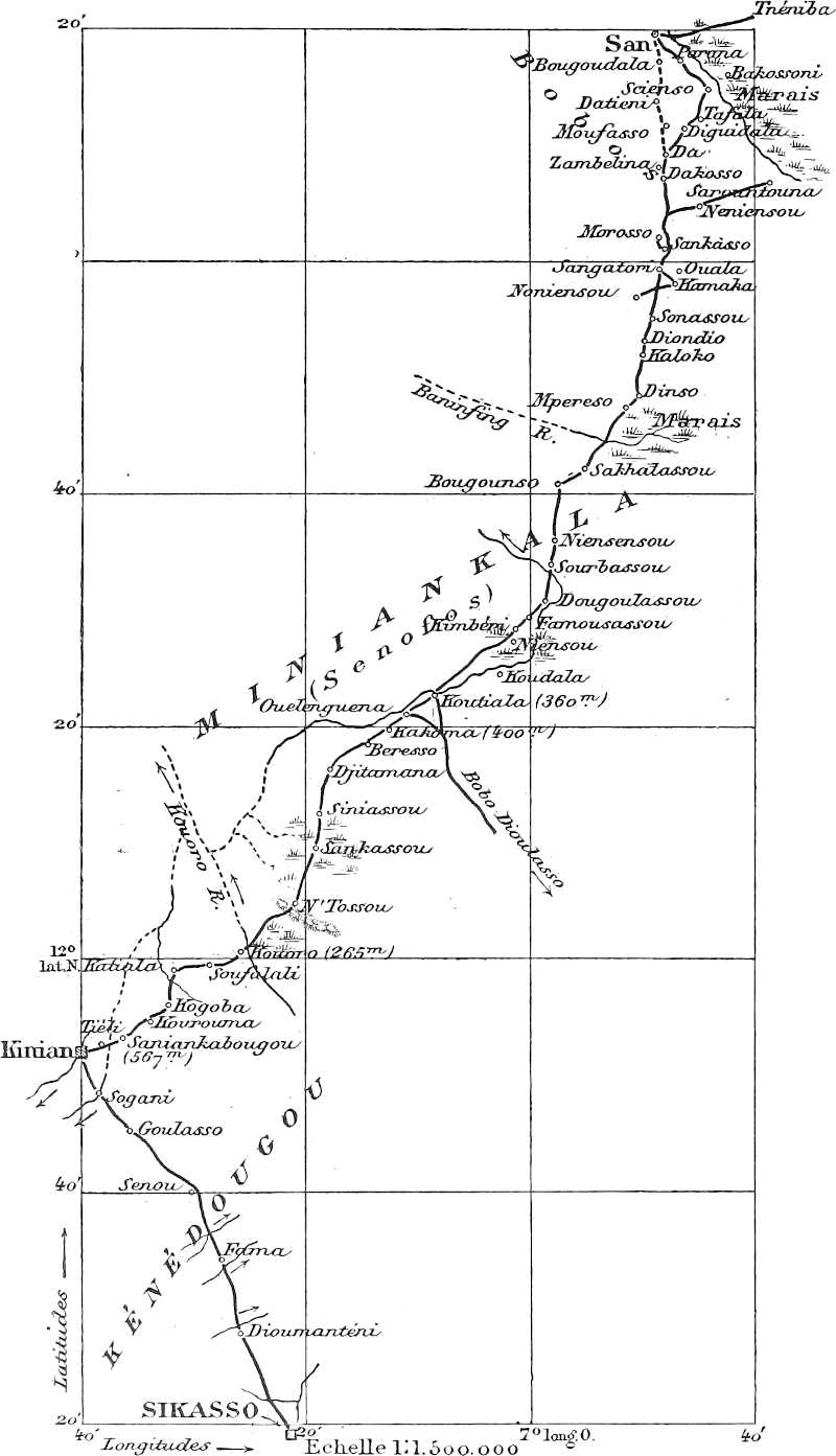 Toutefois, ainsi que nous le verrons par la suite du récit, foule de[9] petits États ou de groupes indépendants de villages existent dans l’intérieur, dont la traversée est souvent plus difficile pour le voyageur que celle des grands empires nommés ci-dessus ; très souvent aussi ils sont en hostilité les uns vis-à-vis des autres. Dans de telles conditions, à l’improviste une attaque peut prendre naissance ; mais j’avais eu soin de prévoir la conduite à tenir. J’emportais les outils de terrassement et de défrichement nécessaires à la construction rapide d’un poste ; une entreprise sur un village m’eût donné les ressources en vivres pour tenir un mois ou deux, vu le peu de bouches que j’aurais eu à nourrir, et je pouvais présumer que des négociations habilement engagées m’auraient permis de me sortir de situation en m’ouvrant la route.