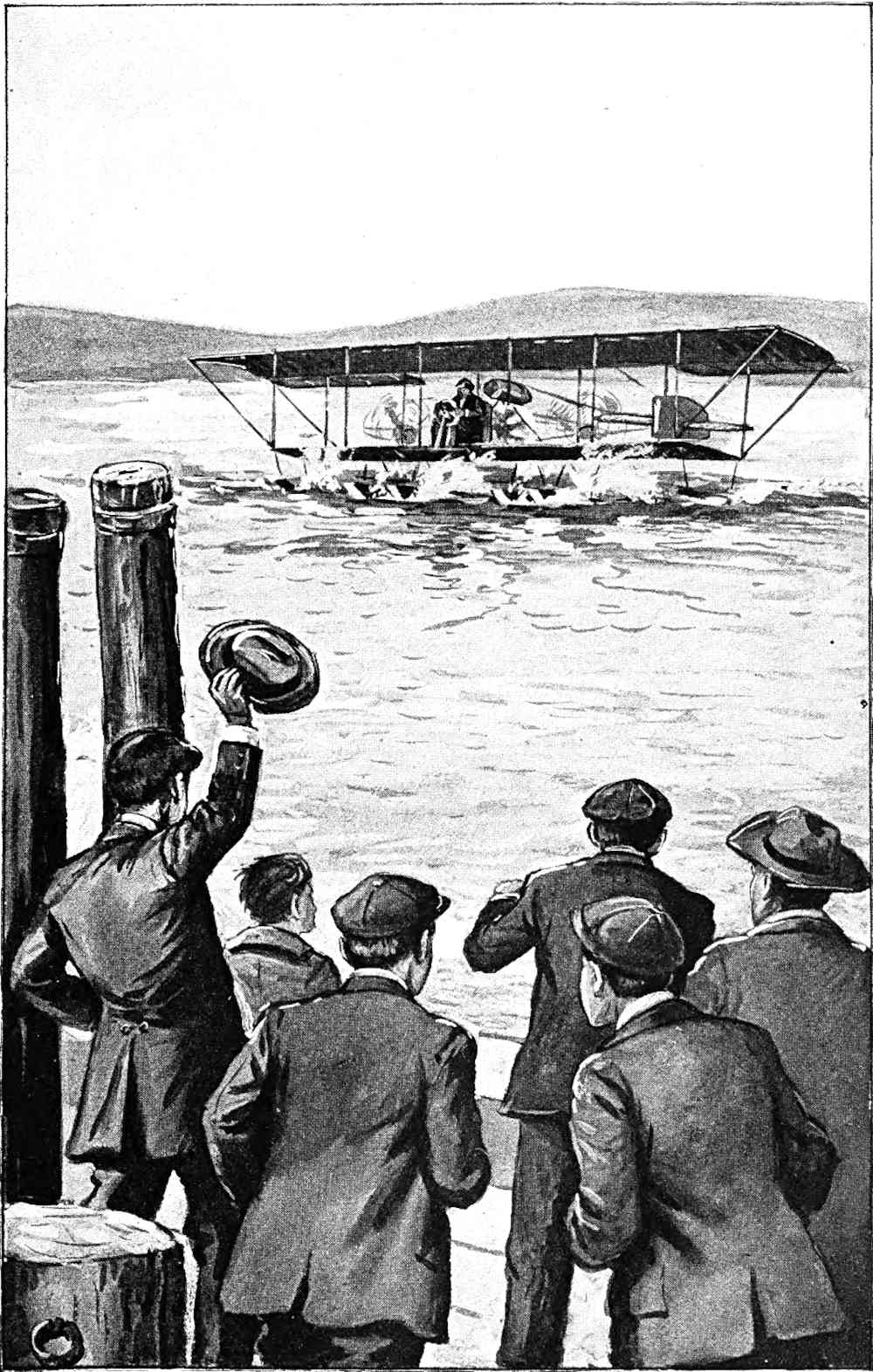 At a given signal the motors of the two biplanes were set going. Up into the air shot the flying [312] machines, each headed straight for the end of the lake. A faint breeze had begun to blow and there was no telling how strong this would become before the race was ended.