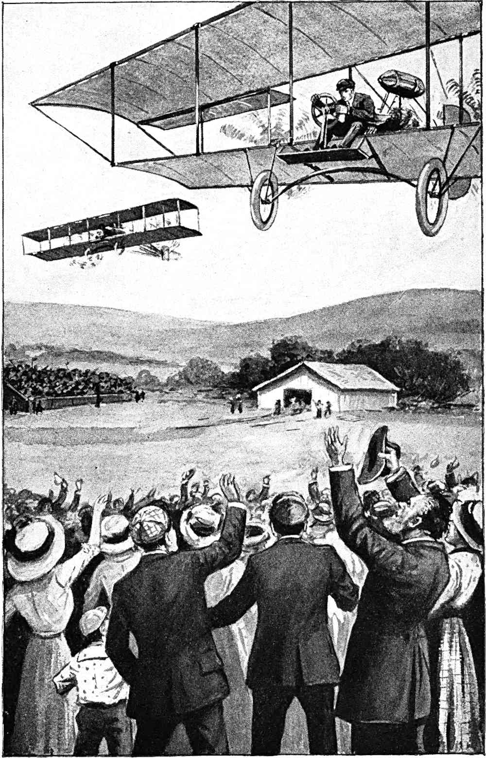 The first long-distance contest was that between the two monoplanes, which were to try a flight to Haverford, Bralham, and return. Both machines got away in good shape, and then the crowd waited impatiently for their return, the band playing in [311] the meantime, and Joe and his chums doing all they could think of to put the Skylark in condition for the other big race.