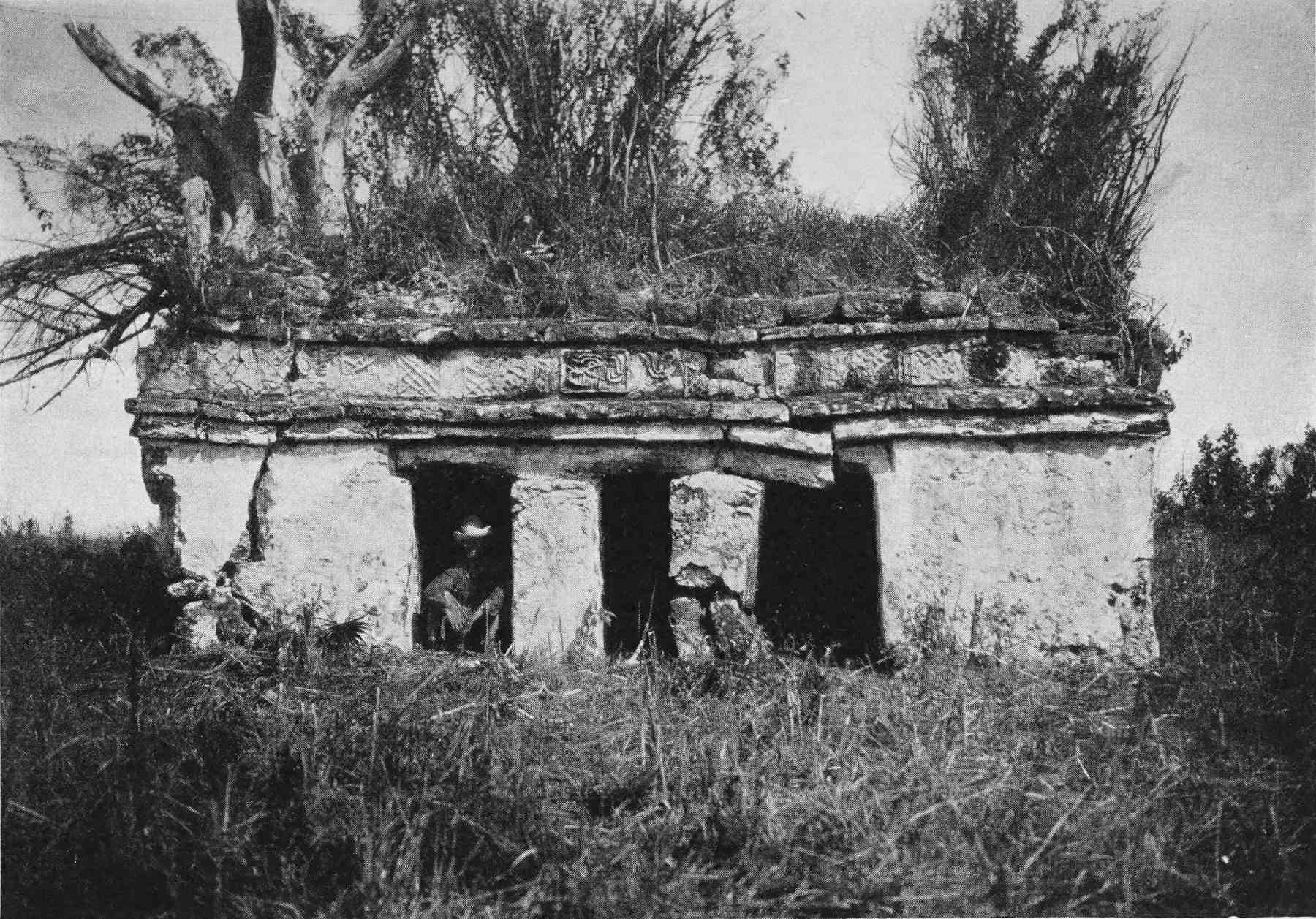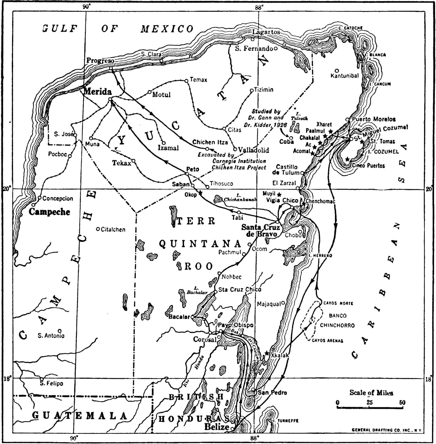 There is glamour and mystery enough in a quest of ancient cities in Central America, yet the finest part of the adventure is intellectual rather than physical. The thrill of breaking through the frontiers [viii] of history into an unknown age is much deeper and more satisfying than that of merely entering closed territory at a slight risk of life and limb. After all, the chances of violent death are probably greater in modern cities than in the most backward lands. Eastern Yucatan will remain in my memory, not as a region where thorns scratch, insects bite, and boats capsize, but as a region where crumbling temples bear the unmistakable stamp of one of the New World’s greatest personalities.