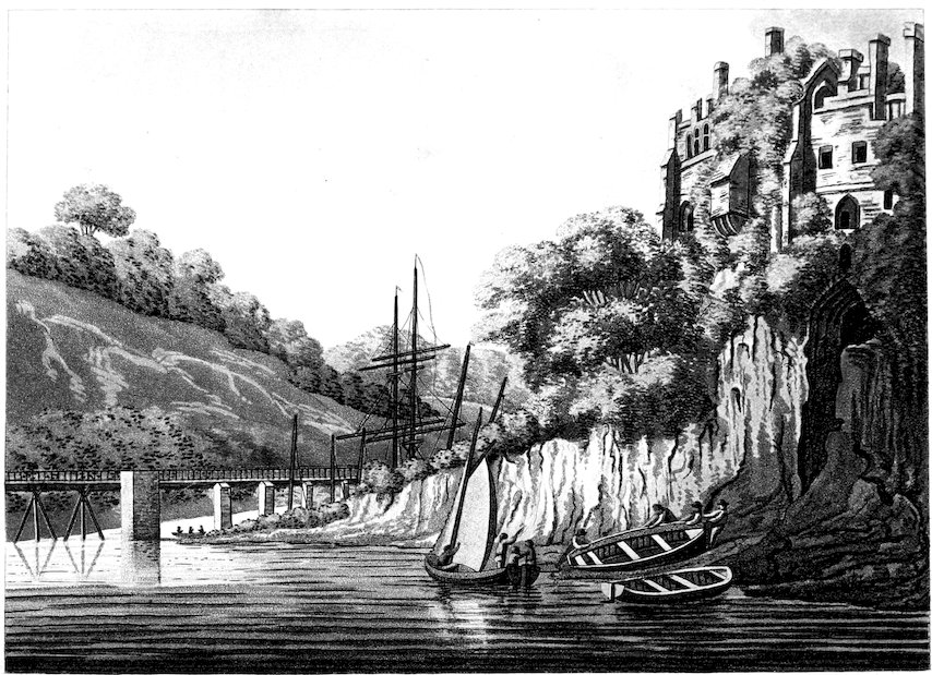 On the opposite shore, the different forms of the cliffs and rich verdure with which they are cloathed, and the masts of the vessels from behind the bridge breaking on the eye, complete the scene, and render it altogether a happy group of objects for the pencil. This bridge is built with timber, and the boards which compose the floor, are so laid as to yield to the water and play some inches. It is seventy feet above the surface of the river, and is so constructed in consequence of the impetuosity of the tide, which, just as it rushes in from the Severn 151sea, being here suddenly confined within a narrow channel, is frequently known to have risen forty feet. As it divides the counties of Gloucester and Monmouth, it is kept in repair at their joint expence.