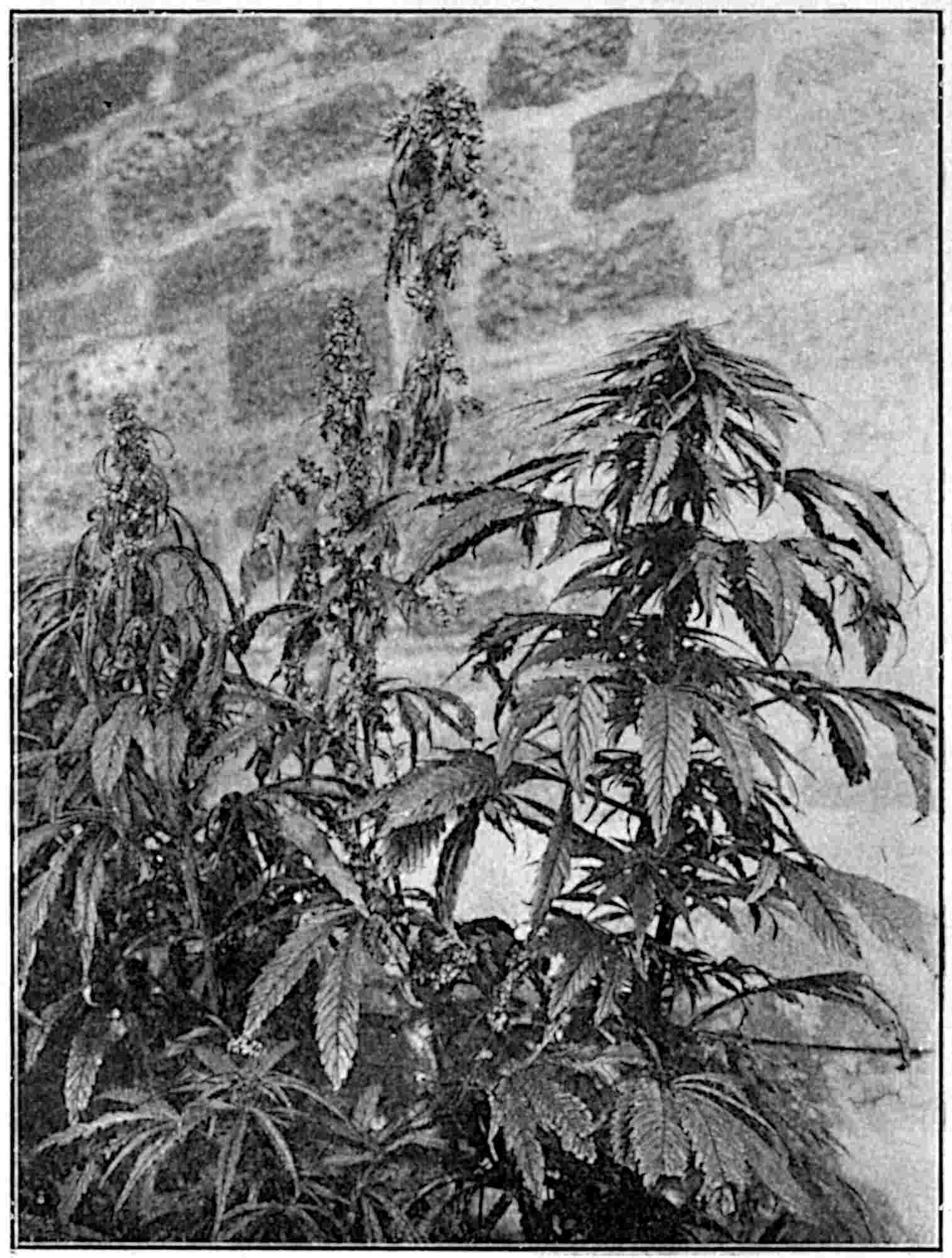 13The second source from which fibre is extracted is that from the stems of plants such as flax, hemp, jute and the like. A photographical reproduction of a group of hemp plants grown by the Authors appears in Fig. 6. A female plant is illustrated on the right, while the remaining two which are taller are male plants.