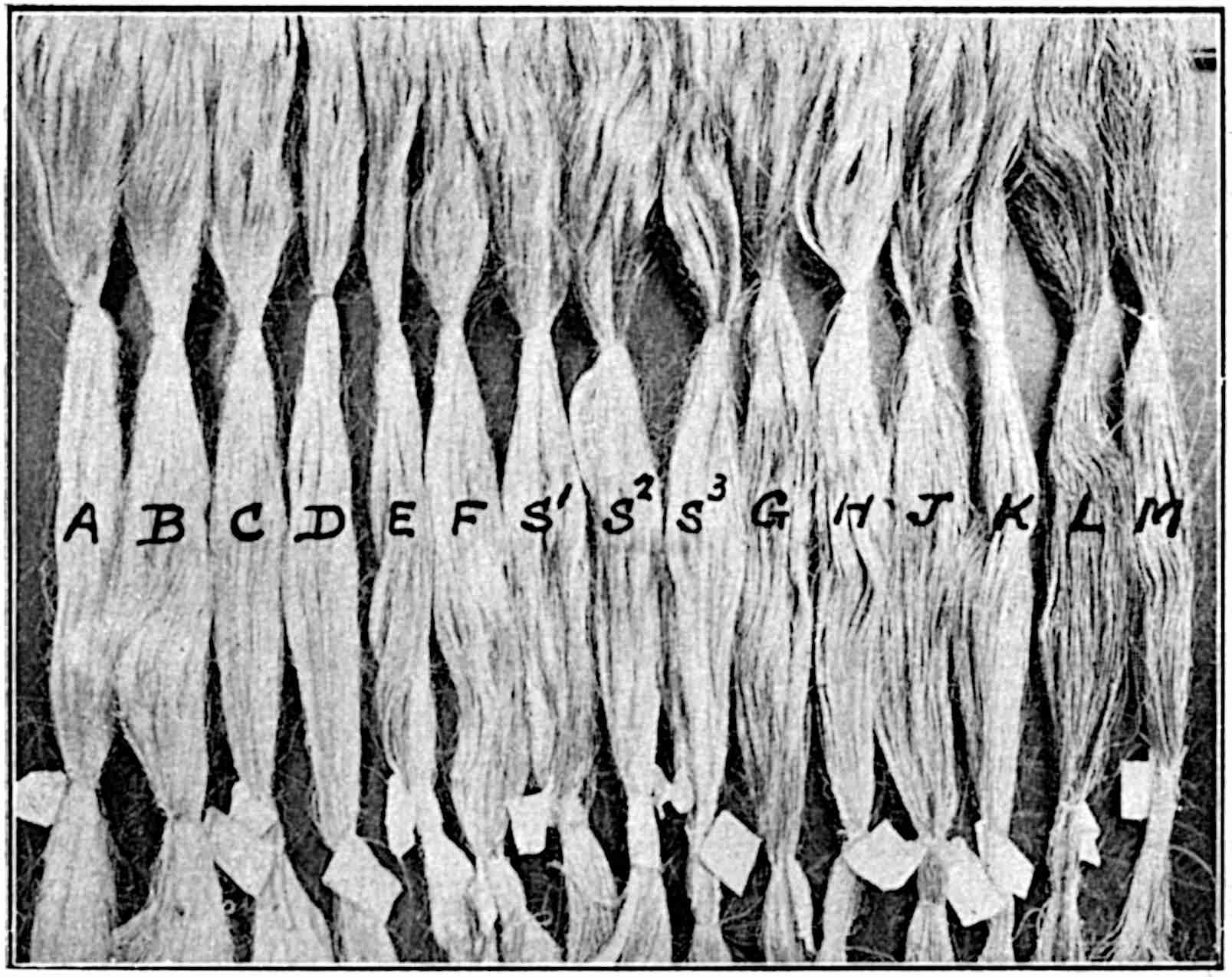 The more or less uncertain knowledge of practically all the earlier attempts at the solution of fibre extraction renders it impossible for us to bridge the gap between the time when crude primitive methods were practised and that which ushered in the more perfect methods described by Pliny in the first century—methods which, in certain cases, have varied little since this early period, and which are practised with a high degree of success. We may, therefore, leave this interesting period to the researches of students in history, 4and enter upon the description and illustration of the various plants from which fibre is extracted, and the actual processes which such fibre has to undergo before it is ready for the market in one or other of the well-known types of cordage.