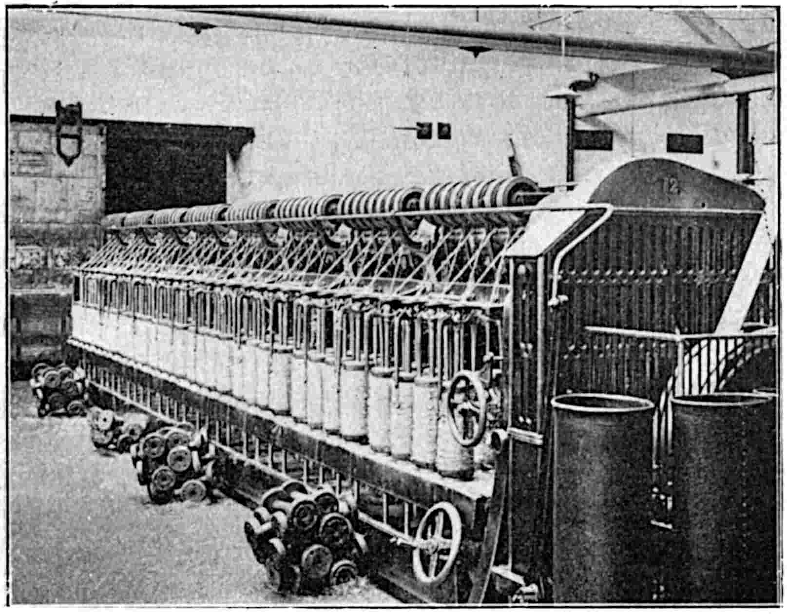 A machine termed a “traveller,” is employed to draw out the strands, and this machine is provided with a series of hooks as well as a central spindle. The strands may be attached as required either to the hooks or to the spindle. A rope-driving gear causes this traveller to move on rails down the walk and for the distance required, and it will be evident that as the traveller recedes from the bank it will draw the groups of threads from the bobbins and through the register plates; at the same time the several hooks are caused to rotate, and thus each strand is twisted and hauled simultaneously.