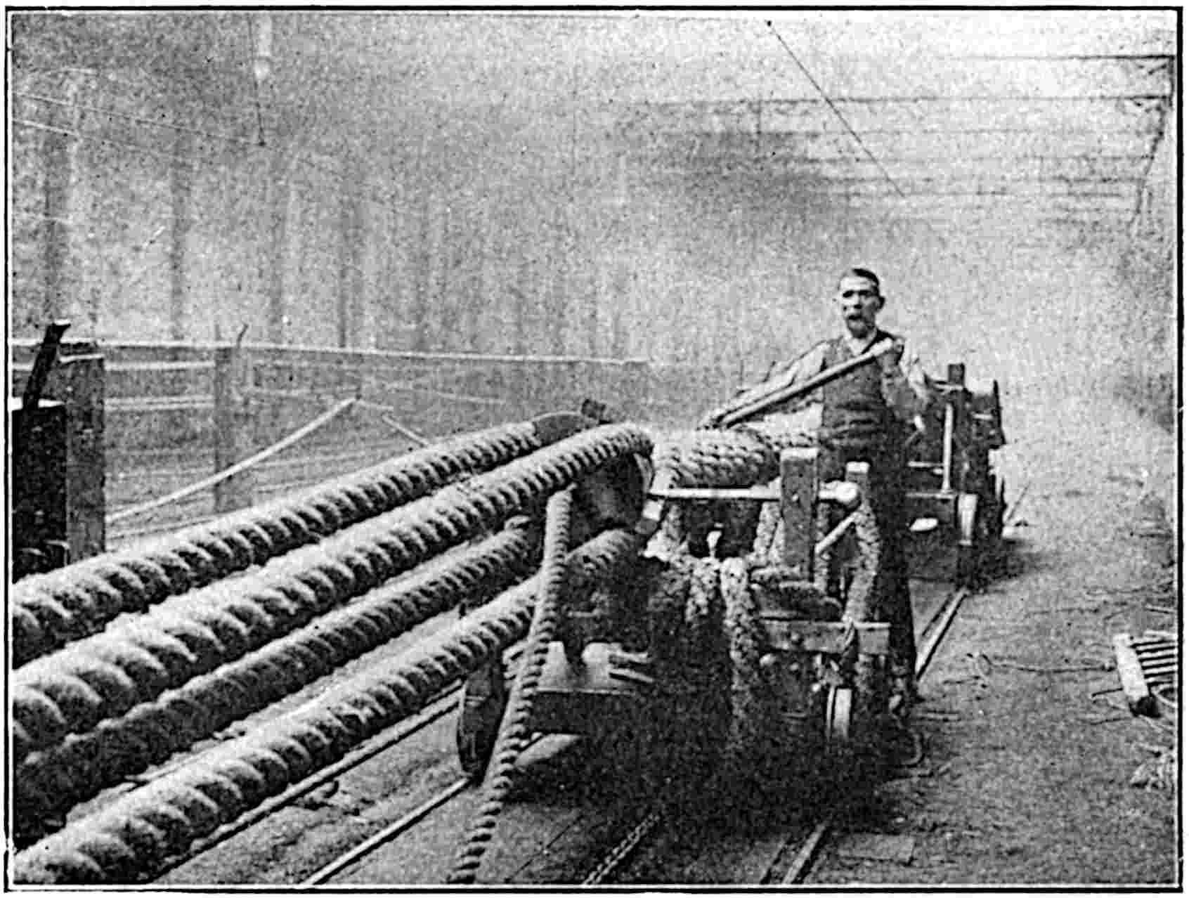 Although the various house machines represent the latest developments in the art of stranding and closing—the 102two essential operations of rope making—a modern rope and cordage works is provided not only with the various machines which have been illustrated and described, but also with a well-equipped rope-walk so that the products may include a great variety of cordage from the finest lines to the mammoth ropes for ships, steamers, harbours and heavy hauling purposes generally.