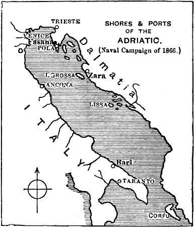 [3] The Affondatore was a new ship built in the Thames just before the war. A correspondent of the Times who saw her at Cherbourg, where she called on her way down Channel, wrote that she looked sufficiently formidable to destroy the whole Austrian ironclad fleet singlehanded.