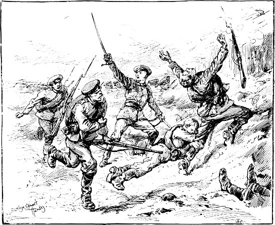 The Black Watch having exhausted their cartridges fell back, thinking the Guards were marching to support them, and the enemy returned in force and entered the village again.
