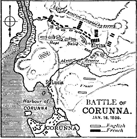 Fine weather now dried our rags. On the 11th January the Guards were quartered in the town, the Reserve near St. Lucia, and the other regiments posted in strong positions. Vast stores were meanwhile destroyed in Corunna, and two hundred and ninety horses of the German Legion shot in the arsenal square at St. Lucia, amid the tears of the brave troopers.