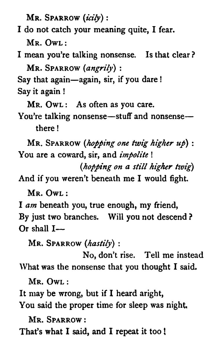 Dear Mr. Owl and Mr. Bear, good-bye! [Exit.