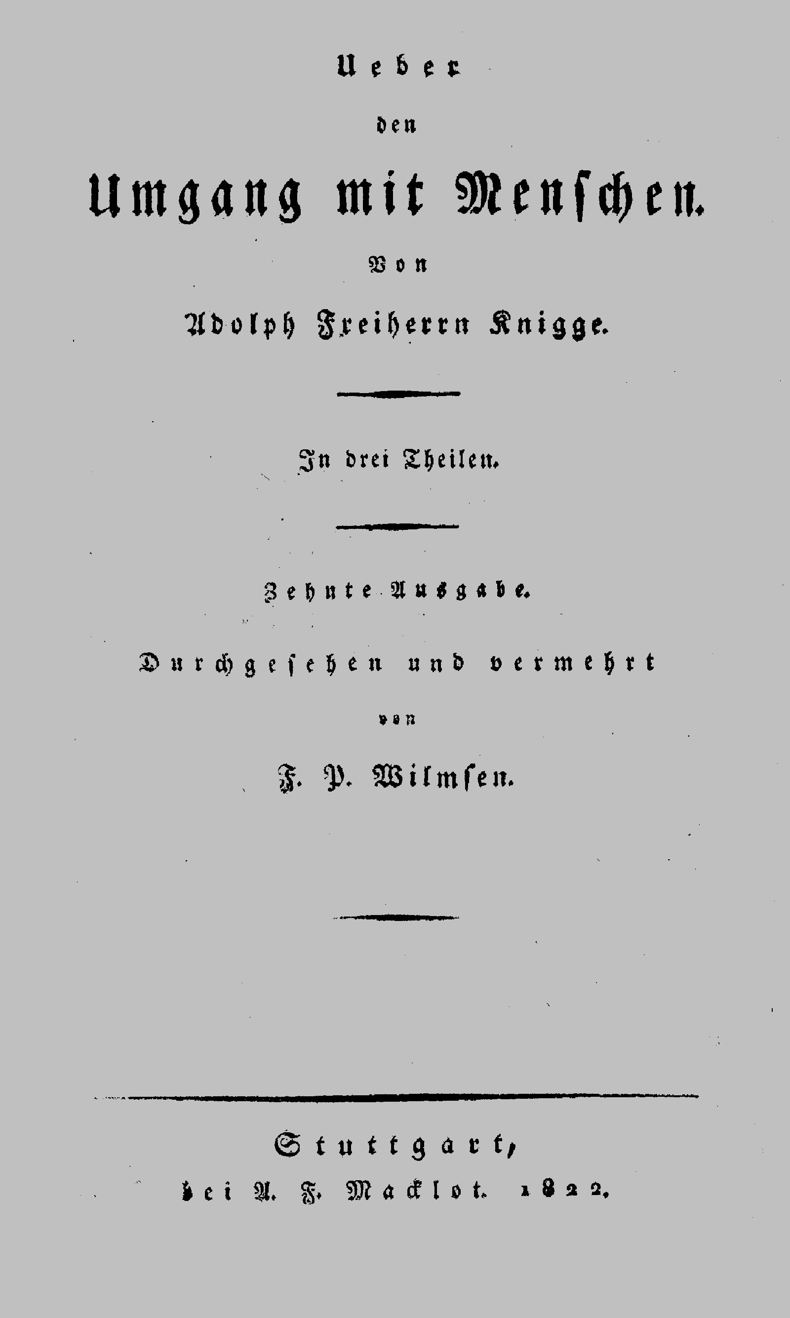 Ich habe den Wunsch der Verlagshandlung, Knigge's bekanntes und geschätztes Werk über den Umgang mit Menschen für die neunte Ausgabe durchzusehen, und mit einer Einleitung, Anmerkungen und Nachträgen zu vermehren, gern erfüllt, weil ich glaubte, dadurch nützlich zu werden. Dies Werk enthält sehr viel Gutes, und kann für Menschen, die auf den mittleren Stufen der Bildung stehen, und wenig Gelegenheit haben, Menschenkenntniß einzusammeln, überaus nützlich werden. Da ich es für Pflicht hielt, Knigge selbst reden zu lassen, so habe ich mir nur da, wo er sich eine offenbare Incorrectheit oder Nachlässigkeit im Vortrage erlaubt hat, eine Aenderung und Uebertragung erlaubt, und solche Anmerkungen, welche für eine Note unter den Text zu wenig Ausdehnung hatten, gleich in den Text selbst verwebt. Dieß glaubte ich um so eher mir[S. iv] erlauben zu dürfen, da diese Anmerkungen größtentheils nur weitere Ausführungen, oder nähere Bestimmungen, oder eine festere Begründung des von K. Gesagten enthalten. Ganz weggestrichen habe ich nur solche Stellen, welche eine offenbare Uebertreibung oder eine nichtssagende Anekdote, oder eine leere Amplification enthielten. Ein zur Vollständigkeit nöthiger Nachtrag enthält besonders die Regeln des Umgangs mit Kindern, worüber K. viel zu kurz gewesen ist, und wird die Brauchbarkeit des Werkes hoffentlich einigermaßen erhöhen und befördern.