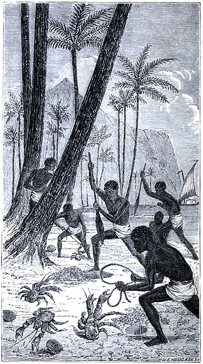 The almost innumerable channels stretching between the coral reefs, lagunes, and palm-clad islands of the Southern Seas are inhabited by legions of Crabs of next [Pg 69]to endless species and varieties. Many of these feed luxuriously on the vast numbers of “Trepang,” or sea slug (Holotharia edulis) found in these latitudes. The human crab industriously seeks his share of this half-grub, half-slug, delicacy, and some account of its nature and mode of preparation may not prove unacceptable to the reader. The Bêche-de-mer, as this uninviting looking creature is called by the traders who deal in it, is in immense request in nearly every market in the Chinese empire, as a stock ingredient to be used in the preparation of the rich, glutinous soups and stews, in which the Celestials so much delight. They are also extensively used to mix with little squares of salt pork, sharks’ fins, and pickled bamboo shoots; when thus combined, served up as a stew, and accompanied by diminutive cups of hot “sam shoo,” or rice spirit, John Chinaman, when fortunate enough to get it, yields himself to gastronomic enjoyment, and cares not to call the most important mandarin in the empire, his uncle. As there are brands of high repute amongst wine producers, so are there high and low class slugs in the sea’s great larder, and there are six kinds well known in the trade.