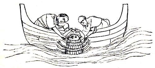 The most important member of the Crab family, in a commercial and gustatory point of view, found in this country, is the large edible Crab of the shops, Cancer pagurus, the subject of the annexed illustration; and its capture not only gives employment to [Pg 9]an immense number of families along the sea-board of England and its home dependencies, but forms an admirable school for the training of the hardy mariners so much needed for both our navy and mercantile marine. The professional crabber is usually an expert boatman, and line, or rather hook-fisher, in addition to his crab-catching powers. There are several methods by which Crabs can be taken, but that usually resorted to for the capture of the kind now under consideration is by crab pots, or baskets, woven of unbarked willows.⁠[2] These are contrived much on the principles of the common wire mousetrap, a number of points being arranged in funnel form at the entrance, so as to admit of free ingress, but rendering exit quite a different affair, and one by no means [Pg 10]easy of accomplishment. The eel-basket, the salmon-trip, and many other fish traps are made in much the same manner, with some modifications as to material and size. Pieces of fish and fish offal are usually used as bait for these contrivances. This is secured within the basket, which, with a heavy stone as a sinker, and a long line with a float attached to it, is lowered down from the boat amongst sunken rocks and in the deep gulfs between reefs, where ledge, crevice, and secret cranny are known to afford hiding-places to the sought-for prey; and here the traps are allowed to rest, sometimes for the night, at others a shorter period, just as convenience or the probability of a take may suggest, when, the float being found and the line hauled in, the pot with its contents are soon safely on board the boat. Where many persons engage in the same occupation, it is necessary, in order to avoid mistakes as to the identity of the traps, to have certain distinguishing marks by which they may be known. Each fisherman, therefore, has his own pattern for the float—one using a single piece of circular form, another, a single square, whilst a third either piles several pieces in conical form, or cuts a peculiarly-formed cross. A plan we strongly recommend to those who wish to amuse themselves by catching Crabs for their own use, is to use a large flat bung, made of stout cork, nail a piece of strong tough wood, such as [Pg 11]elm, to the under surface, in order to prevent splitting, burn a hole with a hot iron large enough for the float line to pass through, tie a knot or work a Turk’s head on the end of the line, paint the upper surface of the cork white, and then burn your initials deeply into the cork with a branding iron. The crabbers as a body are rarely dishonest, but little mistakes are at times made when crab-pots are insufficiently marked by the owner, and Crabs at a premium; still there are very few so utterly indifferent to the voice of public reprobation as to “haul another man’s pots,” a crime in the eyes of a fishing community pretty much on a par with stealing a sheep or robbing a church. Should you embark in the crabbing line, take our earnest advice: provide yourself with a boat with plenty of beam; have every rope, net, and line you use tanned; and never let your boat’s creeper, or “killick,” go on rocky ground without making use of the precaution shown in the accompanying illustration, known as “Becueing,” or the loss of creeper and creeper line into the bargain will be very likely to follow.