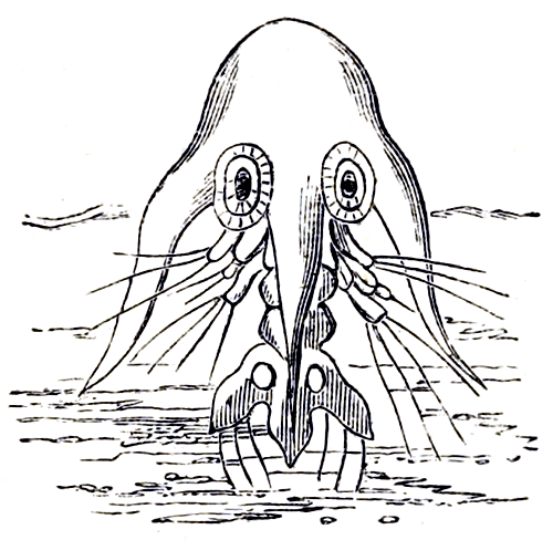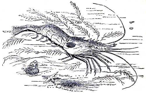 Many of the rivers emptying themselves into the Carribean Sea, after flowing through Florida, contain at their mouths, within the influence of the salt water, Prawns of very large size. These have been improperly called “The crawfish of America,” but they are true members of the Prawn family (Palæmon setiferus); many of these measure between seven and eight inches in length, and like their relatives in other seas, are by no means bad to eat. Many of our readers will no doubt have observed, when engaged in the pleasant operation of shelling their bright scarlet Prawns, before eating them, that on the carapace of one here and there, exists an oval, bladder-like projection, as though some smooth, transparent, univalve shell, had [Pg 87]there closely attached itself. This contains a parasite crustacean. On raising the horny cap, beneath which it shelters, the intruder may be discovered keeping fast hold of the branchiæ, or gills of the prawn, who appears to suffer no inconvenience, or injury, from the presence of his companion. This curious little creature is the Bopyrus crangorum of naturalists; the foregoing illustration represents the common Prawn (P. serratus), with the parasite attached to it. The shrimp form is not exclusively confined to the sea and tidal rivers. Fresh water lakes, ponds, and streams in many parts of the world have their shrimp tenants of one kind or another, many of them highly noteworthy for the beauty of their organization. The fairy shrimp (Chirocephalus diaphanus) is a well-marked example. This elegant little creature is occasionally met with in the fresh water ponds and pools of this country, and can at times be obtained in the neighbourhood of London. Its first appearance strikes the examiner as being most remarkable. The ordinary position assumed by most aquatic creatures, is not to his taste or fancy, so he swims on his back, rising to the surface or sinking away into deep water, just as his will may direct, and gliding here and there, like some tiny elfin boat endowed with vitality. Its colours are most charming and exquisite, clear and transparent, of a delicate sea-green hue; it floats like a shadow through the water, [Pg 88]whilst its host of fringed feet, wave and undulate like growing corn, as they send the passing current through them, and by their ciliary movement, glean the particles of nutritive matter floating by. Its long, bright, red horns and tail serve as a foil to set off the other beauties which nature has so lavishly bestowed. The fairy shrimp rarely exceeds an inch in length, and when placed in a vase of clear water forms a most pleasing object for contemplation.
