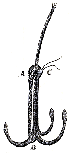 It will be seen, on referring to the above cut, that the line after having been secured to the ring at the [Pg 12]head of the creeper shank, as at A, is brought down and passed under one of the claws as at B. It is again brought up until it meets the ring, to which it is secured with a piece of common twine doubled, or a bit of single spun yarn, as at C. It will be at once seen that, on either of the claws becoming fixed in a rock or under a ledge (a matter of constant occurrence when fishing from a moored boat), by pulling heavily on the line the twine or yarn stopper gives way, and the creeper becomes immediately free by being capsized, and can then be readily hauled in.