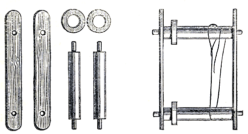 The owners of yachts, and families residing near the sea, will find a few crab-pots, which can be made at a very trifling cost, a valuable acquisition, as not only crabs, but lobsters, cray-fish, and prawns are readily taken in them. Sea fishing-tackle will be found very useful, as after having baited and laid down the pots a number of fish may be very often caught. These will be found acceptable as an addition to the daily bill of fare, and such as are of inferior quality make excellent crab-bait. It is not our intention to enter at any length on a description of sea-fishing gear; still there are certain hints and expedients relating to it which may not prove unacceptable to the reader. Lines vary much in substance and length with the description of fish it is intended to capture, cod, conger eels, hake, &c., requiring them of considerable strength and power; but it will be found, as a rule, that the lines used by the regular fishermen of our coasts are much stouter than is necessary, and it may be depended on that the finer the tackle is, consistent with the requisite strength to hold the fish when hooked, the more successful will [Pg 15]be the result of its use. It is very seldom indeed that a line is broken by a fish, unless from some flaw or imperfection, the trace on which the hook is tied being far more frequently the point of breakage. Strong silk-worm gut, either single or twisted, is much to be preferred to the hemp snoodings in common use for all traces but those used in the taking of the very largest descriptions of sea-fish. The round plait prepared salmon line, sold by all fishing-tackle makers, answers admirably for a general sea-line. The length may be proportioned to the depth of the water it is intended to fish, but about thirty yards is a convenient quantity to deal with. This should, for hand-line fishing, be kept wound on a frame reel. One of these is easily made as follows:—Two flat pieces of tough strong wood, such as oak or ash, about a foot long, an inch and a half wide, and a quarter of an inch thick, are to be prepared; at each end of these, at about two [Pg 16]inches from the extremity, a round hole is to be either bored, or burnt with a hot iron. Two round wooden bars of about ten inches in length, and the size of an ordinary walking-stick, are now to be prepared, cutting each end to fit the holes in the flat bars, so that they may pass through them, and extend about two inches beyond. A shoulder must be cut in each joint, in order to prevent the bars from coming together; when put in place they are secured with small pins or brads; but, before fixing them, a round flat piece of cork is to be run on each round bar to stick the points of the hooks in; the cut on p. 15 shows the shape of the framework and the reel complete. Reels of this description are much to be preferred to the common kind, on account of the free ventilation they afford the lines when wound on them, and the freedom from entanglements insured by the cork hook-holders. The traces before referred to may be used of either single, double, or triple strands. All gut before being knotted together should be steeped for ten minutes or a quarter of an hour in warm, not hot, water; the curled portions [Pg 17]and ends are to be cut off, and the required number of lengths selected as to stoutness. They can now be attached to each other by the use of the gut knot, as shown in the preceding cut. This, when drawn home and the ends trimmed off, forms a very secure fastening. To make a double or triple gut trace it will be necessary to twist the strands constituting it. This can be readily done by knotting the extreme ends together and then placing them between the back spring and blade of a common pocket-knife, as shown in the annexed cut. The other ends are now taken by two or three persons, according to the number of strands to be twisted, held between the finger and thumb, and turned until a spinning motion is communicated to the knife hanging in the middle, when the trace is very quickly finished,—six feet is a good length for general purposes. All hook-lengths and traces should be attached to the main line by brass swivels. A short, stiff rod, with stand-up rings, fitted with a large-sized Nottingham reel, on which fifty or sixty yards of prepared line has been wound, will be found useful for taking many kinds of fish, and an extra joint or two adapts it [Pg 18]for fishing from rocks or pier heads. When using tackle of this description from a boat for the capture of small fish, as pouting, chads, whiting, &c. are commonly called, it will be found a good plan to employ a foot trace of twisted gut, medium-sized trout-hooks tied on strong single gut snoods; these may be looped on at eighteen inches apart. The bottom of the trace must be secured to one of the conical sinkers of sufficient weight to keep the line straight down against the run of the tide. Bait with rag-worm, and commence fishing at about three feet from the bottom, when, if the fish are not found feeding there, shallow depths may be tried, or the ground itself just touched with the lead, only taking care that a sufficient strain exists just to slightly curve the top of the rod; on feeling a bite, strike sharply, and when the fish is found to be hooked, draw the line in with the right hand, whilst the rod is upraised in the left, until the prize is at the surface, when, unless very diminutive indeed, the landing-net should be made use of,—more fish are lost in weighing out than in any other way. Large captives must be played until sufficiently passive to be safely brought alongside and netted or gaffed.