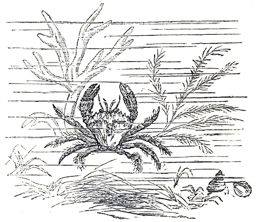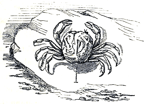 On some of our coasts a great number of Crabs are taken with the crab-hook. This is a sharp strong hook of tough iron, fastened to the end of a stout wooden staff, or pole, and the best time to use it is when the sea recedes during spring tides, and makes what among fishermen, is called a “great out.” At such times a great number of deep rock pools and hollow ledges become accessible, which during ordinary [Pg 23]tides are far beneath the waves, and now is the harvest of the adventurous crab-hunter, who, hook in hand, climbs and scrambles among the slippery stones and weed-covered crags, to where narrow cleft and dark recess give promise of Crab’s lurking-places, when with a cautious probing motion, the curved instrument is thrust onward along the hidden galleries beneath the rock, until the practised hand detects the hoped-for impediment, when with one sudden, dexterous, backward stroke of his weapon he withdraws the retiring Cancer from his snug retreat, and exposes him to the garish light of day. Give him but one instant for reflection, and up goes his back against the roof of his hole, when, except by literally pulling him in pieces, extraction is a sheer impossibility; and it is in consequence of this exceedingly unaccommodating habit of his, that would-be crab-catchers have been at times crab caught, and their incautious groping hands held fast as though in the vice of some sea Vulcan, until the flowing tide has put an end to both their struggles and sufferings. The tenacity of a crab’s grip is perfectly extraordinary and all but incredible. A hold once taken is seldom let go, and the battles which frequently take place among these pugnacious gentry give ample scope for the exercise of their tremendous nippers; and nature has most wisely provided them with the power of throwing off such limbs as may be either seized by the enemy or [Pg 24]seriously injured; and should they chance to encounter an antagonist from whom it appears wise to beat a retreat, our friend firmly seizes him by the most tender spot he can select, sets his pincers nipping and grinding in the most excruciating manner, and then rapidly detaching and leaving them in possession, darts off to the first sanctuary within his reach. To most living creatures the unceremonious sacrifice of limbs in this way would lead to almost immediate loss of life from hemorrhage, but a wise provision is also made for this contingency. The division taking place at a constricted portion of the joint of a limb admits of the vessels drawing themselves in, and so stopping the flow of blood. A thin membrane soon covers the stump, and in due time another limb replaces that which has been lost or cast away. In some localities the haunts of the Crab are discovered by fastening pieces of waste fish to the ends of short, strong lines, and then, after attaching long stones by their middles to the other ends, strewing them about among the rocks and pools; at the ebbing of the tide, these tell-tale stones are sought for as they rest outside and across the dwelling-places of the Crabs, which when found are not only “made a note of,” but the tenants either by hook or crook brought to light with little ceremony.
