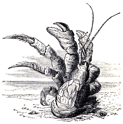 The crustaceans, to whose homes we propose bending our steps, have some strange and note-worthy peculiarities of form, structure, and habits. Instead of, like ordinary creatures, having skeletons in them, on which their tissues are disposed (much as fashionable milliners arrange the captivating raiment of the fair), they, in an apparently perverse and independent spirit, adopt a custom of their own, which to us would, to say the very least of it, prove most uncomfortable and inconvenient, and wear their skeletons outside instead of in; and although fashions do not (so far as our experience has gone) change in the realms of King Neptune, and no startling announcement meets the eager eye of Mrs. Crab, or the charming Misses Lobster, that a sweet new thing in skeletons has just arrived at the emporium of Sponge, Limpet, and Co. Limited, [Pg xvi]no crustacean lady or gentleman ever thinks of being content with one, for the term of her or his natural life; but as the external coverings become worn, and feel uncomfortably circumscribed, a restlessness, and yearning for variety is felt; and, like Professor Owen, their longings are for a new skeleton, and, like that gifted anatomist, rest not, until one is obtained. Unlike the page who, in a complete suit of armour, accompanied his noble master to the Holy Wars, and, as the legend goes, returned after years of absence, a dwarf, from having nothing else to wear, our friends are more prolific in expedient, as will be seen by those who investigate.