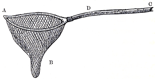 This designing little Genius, after raising his own sand storm, adroitly scoops for himself a tiny trench in the soft material on which he rests, and then remaining perfectly still, allows the falling grains to cover him snugly in, like a sheep in a snow-drift. Great numbers of Shrimps of this kind, as well as small flat fish, and an endless number of odd waifs and strays, can be taken with the dredge—a contrivance shown in the following cut. The framework is of iron, the two straight bars or bridle rods are made so as to play freely round the end bars of the frame, as at a, whilst a sort of hinge joint admits of their moving up or down, thus insuring close contact between the lower [Pg 75]edge of the frame and the bottom, as it is dragged along by a rope, either lowered from a boat or attached to a horse. The extreme end, or purse of the net, is made to untie like the mouth of a bag as at B, which greatly facilitates the removal of its contents when overhauling is needed. The two rings, C C, serve to attach the drag rope to.