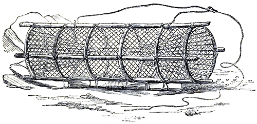 As seen on the marble slab of the fishmonger, is very unlike his relatives beneath the waves. The curled up form in which he is seen when so exposed is not that usually assumed in its own element, unless in the act of exerting its immense powers of retrograde motion. These are so great that one sudden downward sweep of its curiously constructed, oar-like tail, is sufficient to send it like an arrow, three or four-and-twenty feet, with the most extraordinary precision, thereby enabling [Pg 91]our friend to retreat with the greatest rapidity into nooks, corners, and crevices among the rocks, where pursuit would be hopeless. His eyes being arranged on foot stalks, or stems, are free from the inconvenient trammels of sockets, and possess a radius of vision commanding both front and rear, and from their compound form (being made up of a number of square lenses) are extremely penetrating and powerful. The slightest shadow passing over the pool in which the lobster may chance to be crawling or swimming, will frequently cause one of these sudden backward shoots to be made, and H. vulgaris vanishes into some cleft or cavity with a rapidity of motion which no harlequin could ever, even in his wildest dreams, hope to achieve. Down among the deep channels, between the crags at the sea’s bottom, alarms, except from the sea robbers themselves, are not to be dreaded. Here the lobsters are at home, and in such spots the wicker-trap, before described and figured, or the trunk-net represented in the above cut, may be laid down for them. Nets of [Pg 92]this kind are in general use. They are made by fastening a number of stout, wooden hoops to longitudinal bars, and covering them with network. Their internal construction is much like that of the crab-pot, only there are two entrances instead of one, and twine is used in lieu of willows or twigs to prevent the prisoners from escaping. Heavy stones are attached to them as sinkers. Fish offal is used as bait, and corks at the end of lines serve to point out their position and haul them up by. Lobsters are prolific creatures, and it is well that they are so, considering the enormous quantities consumed every day in England alone.